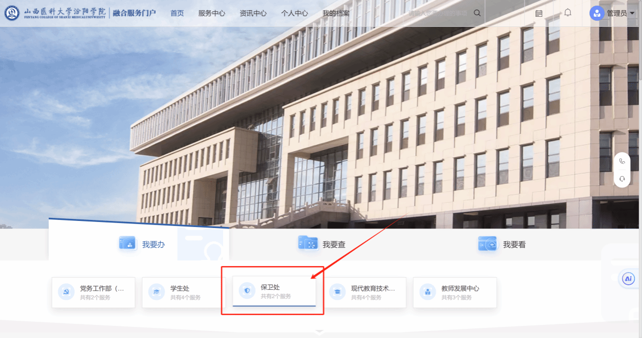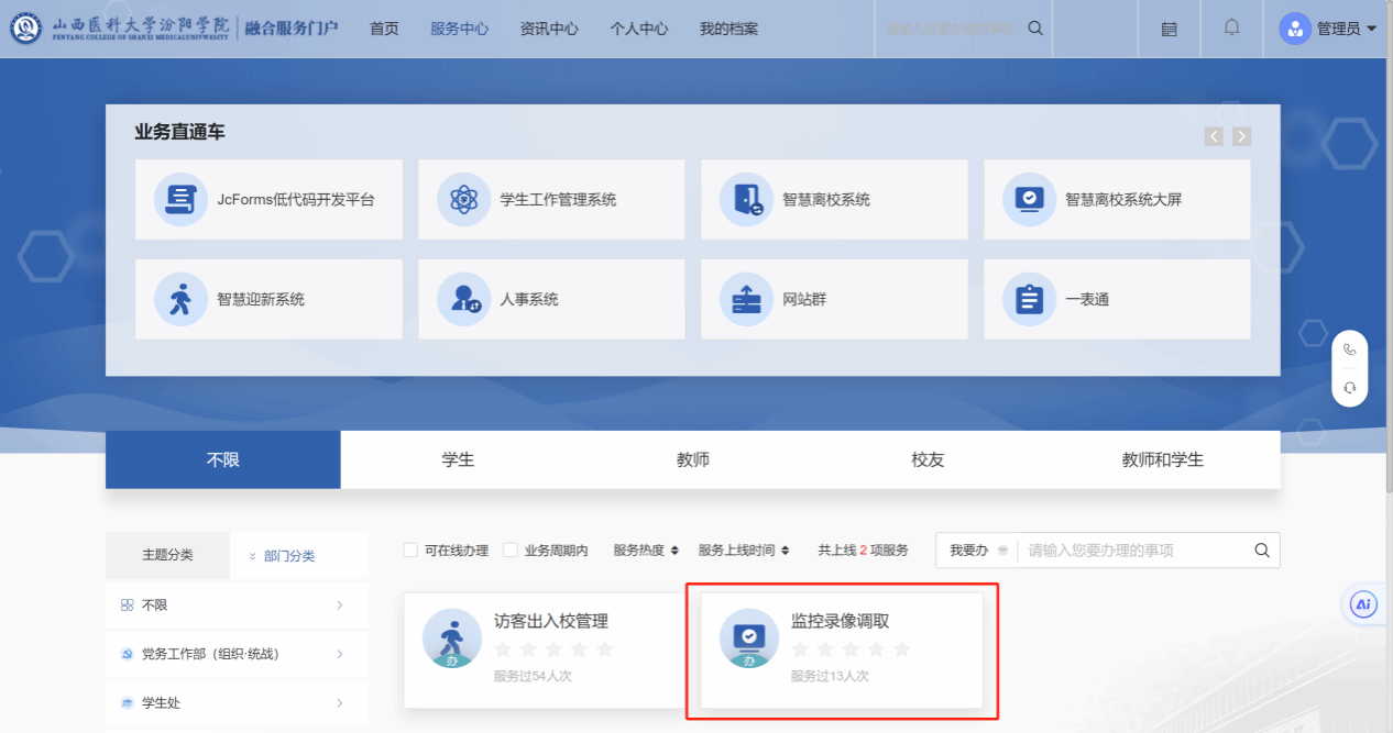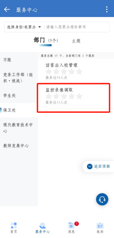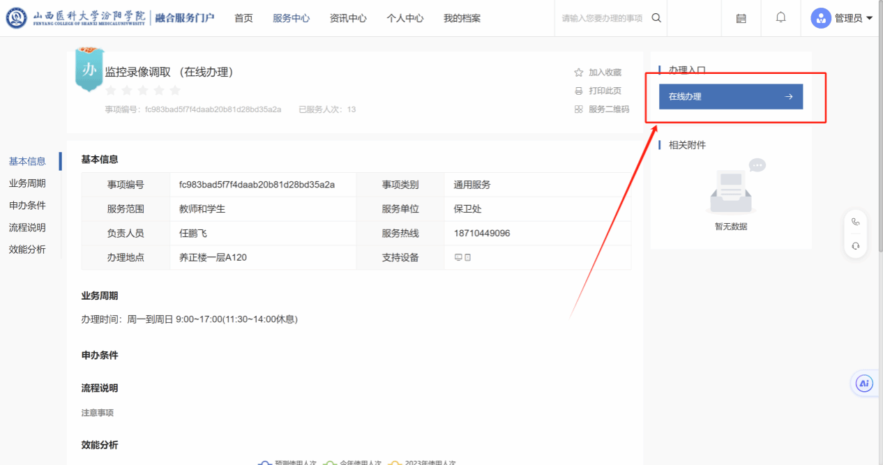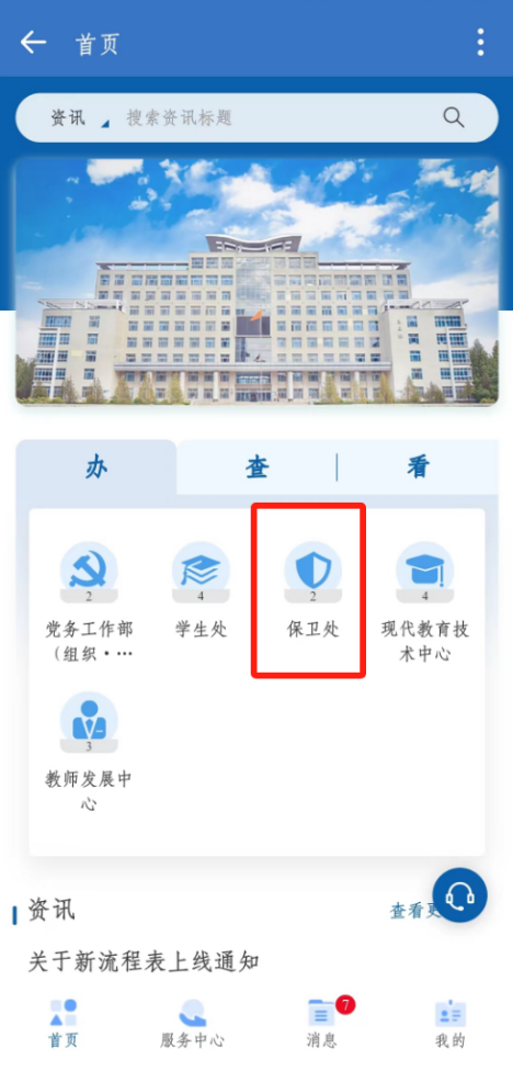 2、登录成功以后,从页面点击“保卫处”,选择“监控录像调取”,点击右上角“在线办理”即可填写申请表。