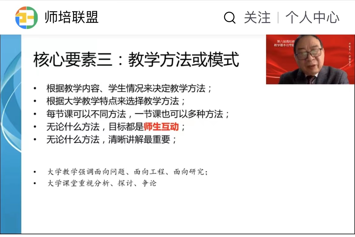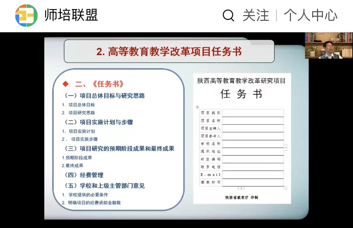 教学研究是课堂教学能力提升的源头活水,是科学研究在教育教学中的具体体现。来自西北农林科技大学的谢寿安教授详细介绍了教改项目的建设与申报。教学改革研究项目是提高人才培养质量,促进教师自身发展的重要举措。他在培训中将教学改革与课程思政密切结合,体现了“研究+思政”的新理念。随后,谢寿安教授介绍了高等教育教研项目的“6书”填报及管理要点,强调了选题的重要性和基本原则。
