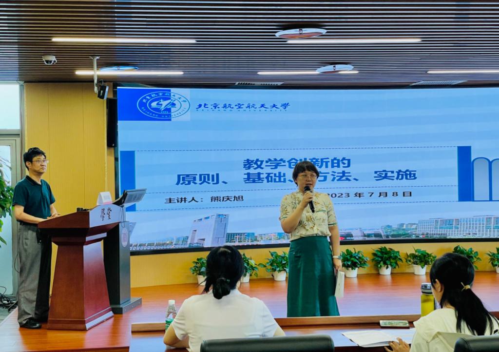 下午,熊庆旭教授针对“教学创新的原则、基础、方法和实施”做专题讲解。教学创新要在知识、能力、思维和思政四个层次进行精准发力。教学创新是教学基本功的发展与突破。学生的提问和教师的反思是教学创新的两大源泉。学生的提问中通常包含深受大学生欢迎的鲜活内容,教师的反思也能反映出课堂教学创新的效果评价。师生同频共振,教学创新双赢。