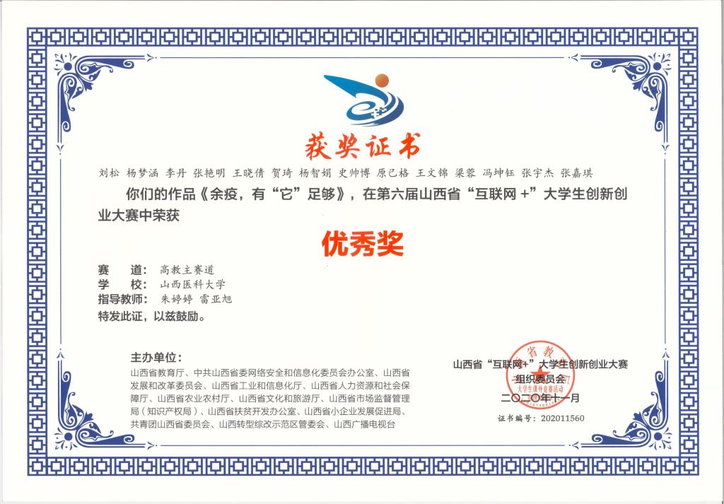 近日,2020年第六届山西省“互联网+”大学生创新创业大赛结果公布,beat365作品《余疫、有它足够》在高教主赛道中荣获山西省优秀奖,并在山西医科大学“互联网+”大学生创新创业大赛中荣获二等奖。