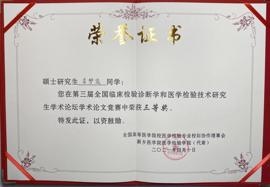 4月9日,第三届全国临床检验诊断学和医学检验技术研究生学术论坛在河南新乡隆重召开。beat365临床检验诊断学研究生郝晋芳、刘利、李梦俊代表山西医科大学汾阳学院进行了论文汇报,分别荣获了两个二等奖、一个三等奖的好成绩。