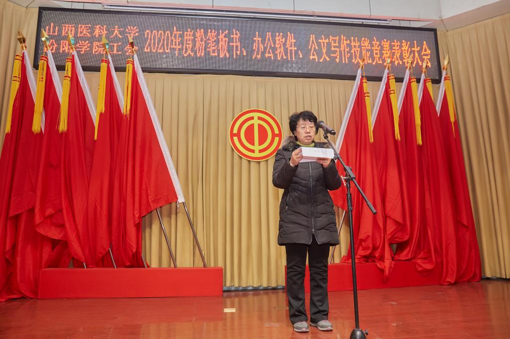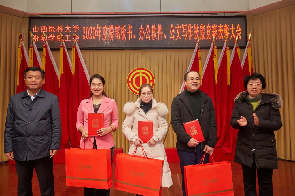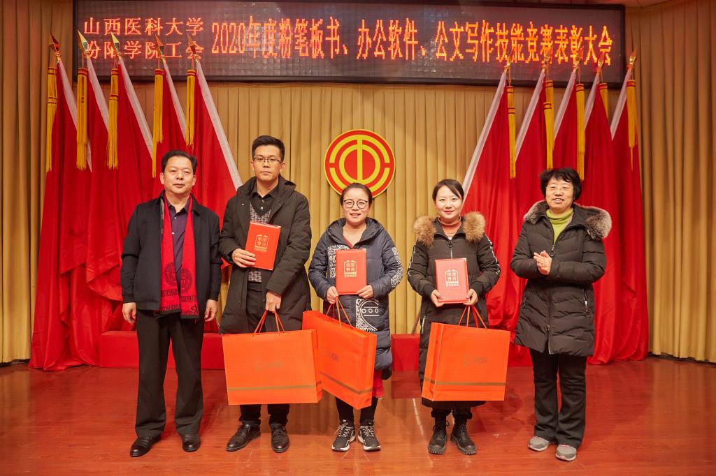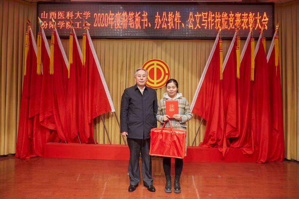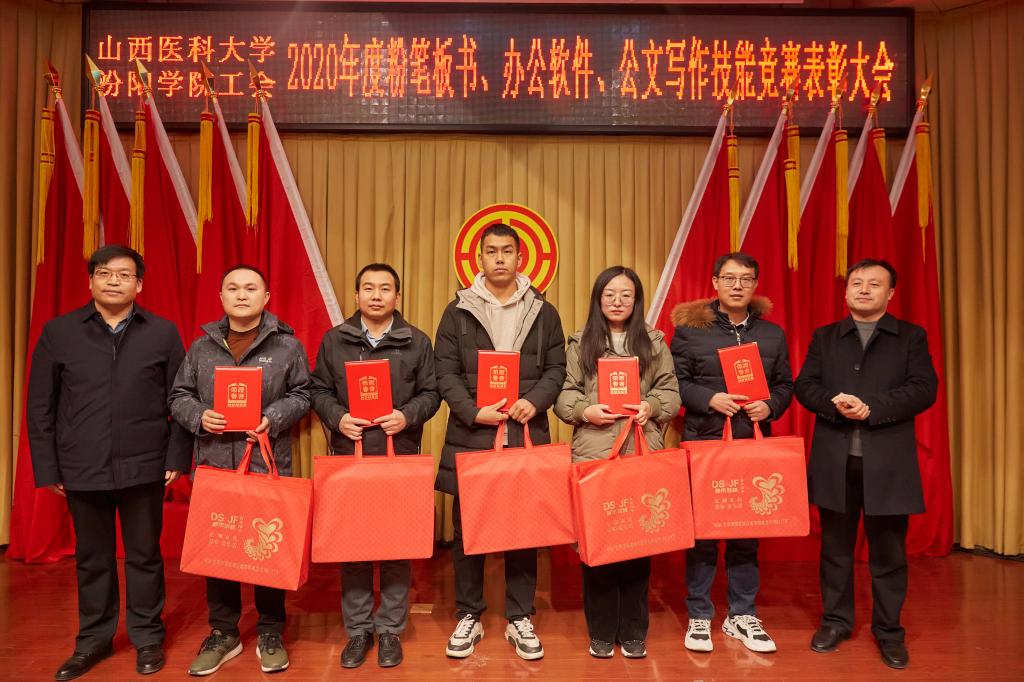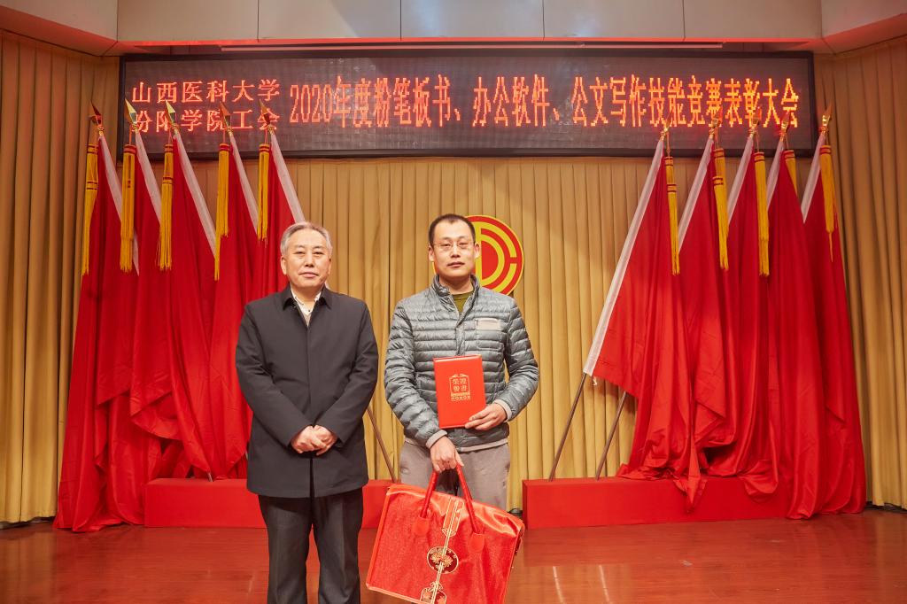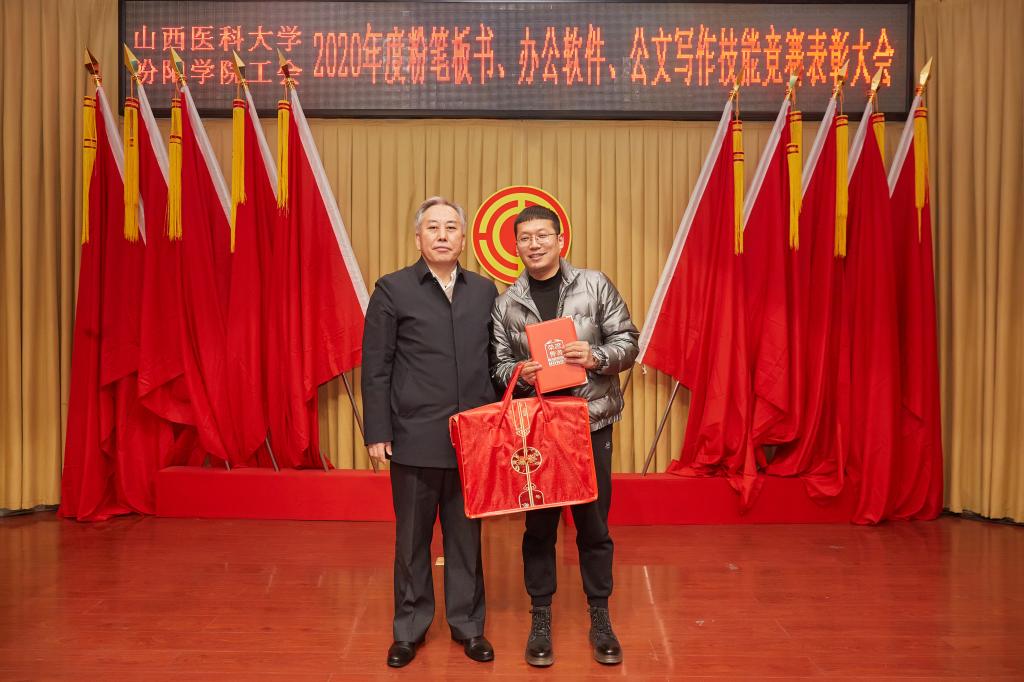 仪式上,党委副书记任云青宣读了《山西医科大学汾阳学院工会关于表彰教职工粉笔板书、办公软件、公文书写竞赛获奖个人和集体的通知》,参加仪式的领导为杜跃、庞蓉、殷林孝等65名获奖选手和临床医学系分工会、医学检验系分工会、图科教分工会3个获奖集体颁奖。获奖代表检验系副主任、分工会主席张晓延发言。