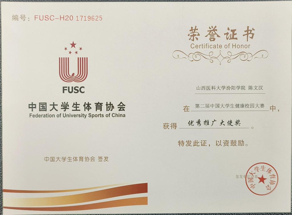 第二届中国大学生健康校园大赛于2022年9月5日正式启动。赛事由中国大学生体育协会主办,面向全国在校、在读本、专科学生和研究生,全国共441所高校,超100万名学生报名参赛。经上半赛季、下半赛季累计36周、252天的激烈角逐,beat365荣获“健康校园大赛一等奖”,基础医学部体育教研室陈文汉老师荣获“优秀推广大使奖”,基础医学部体育教研室主任邢月丽和教师张丽、杨伟、袁超、黄登峰、陈文汉荣获“优秀指导教师”,参赛学生马国桦、刘宇姗、李慧敏荣获“优秀运动员”。