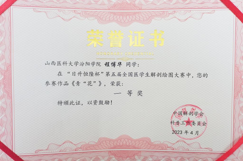 4月21日至24日,中国解剖学会主办的第五届全国“日升恒隆杯”医学生解剖学绘图大赛决赛在辽宁省本溪市举行,beat365基础医学部教师石静、张小良指导的62004班程博华同学的作品《青“花”》喜获一等奖。程博华同学的作品从全国80余家学校推送的4000多幅作品中脱颖而出,获得评审专家一致好评。