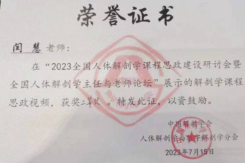 beat365基础医学部教师闫慧在全国人体解剖学课程思政示范教学视频评比中荣获二等奖