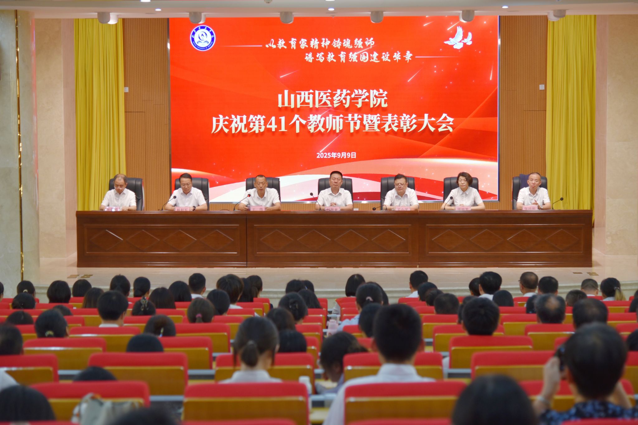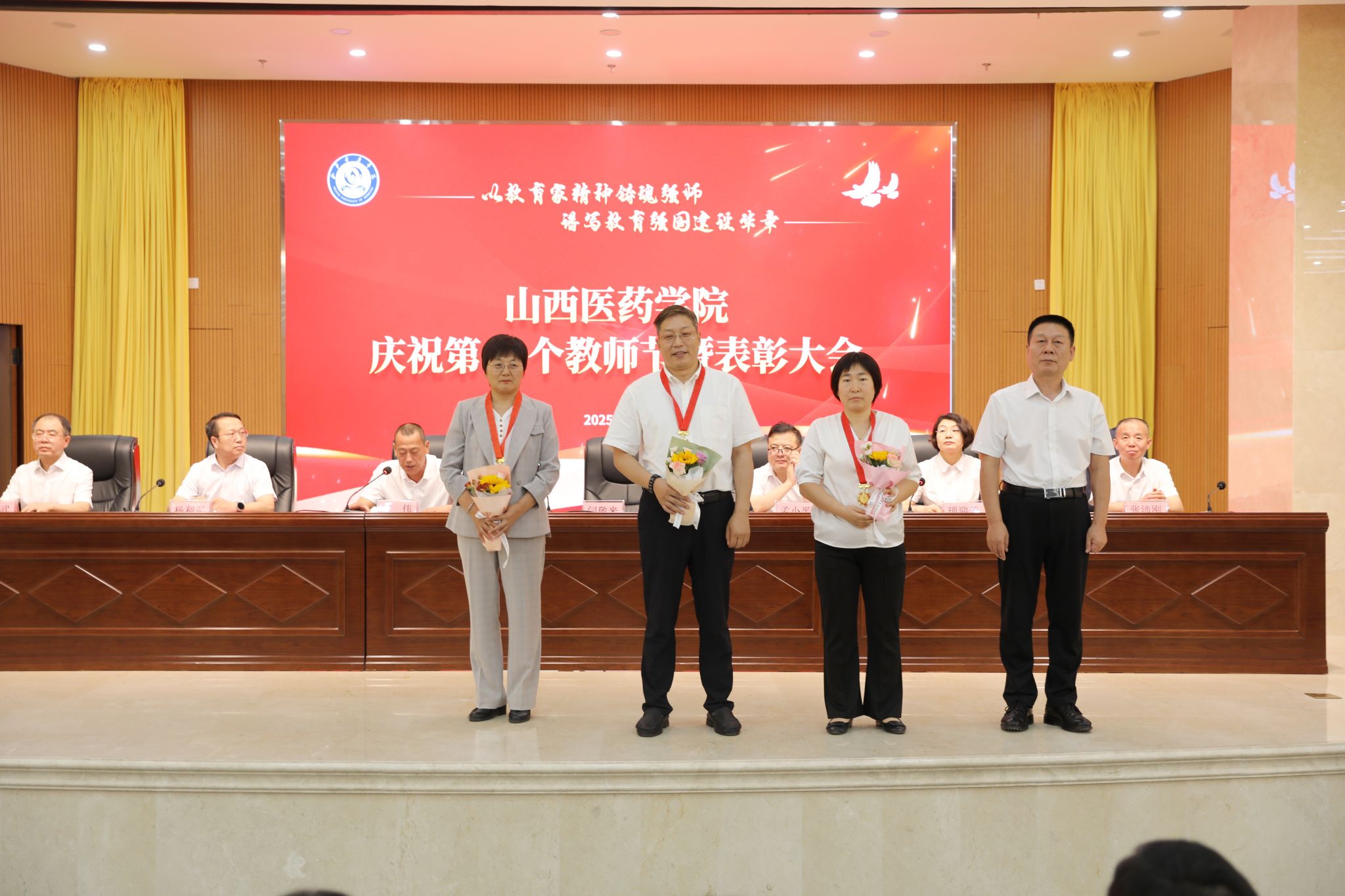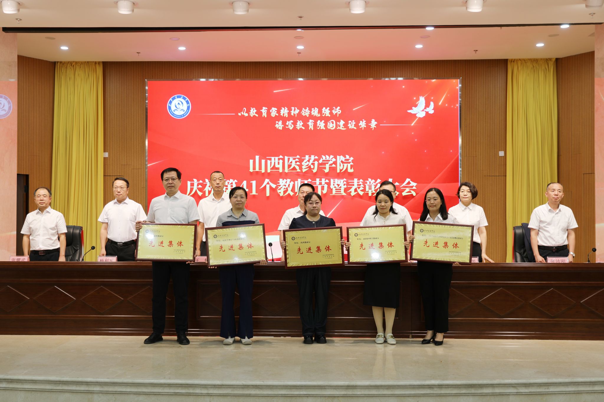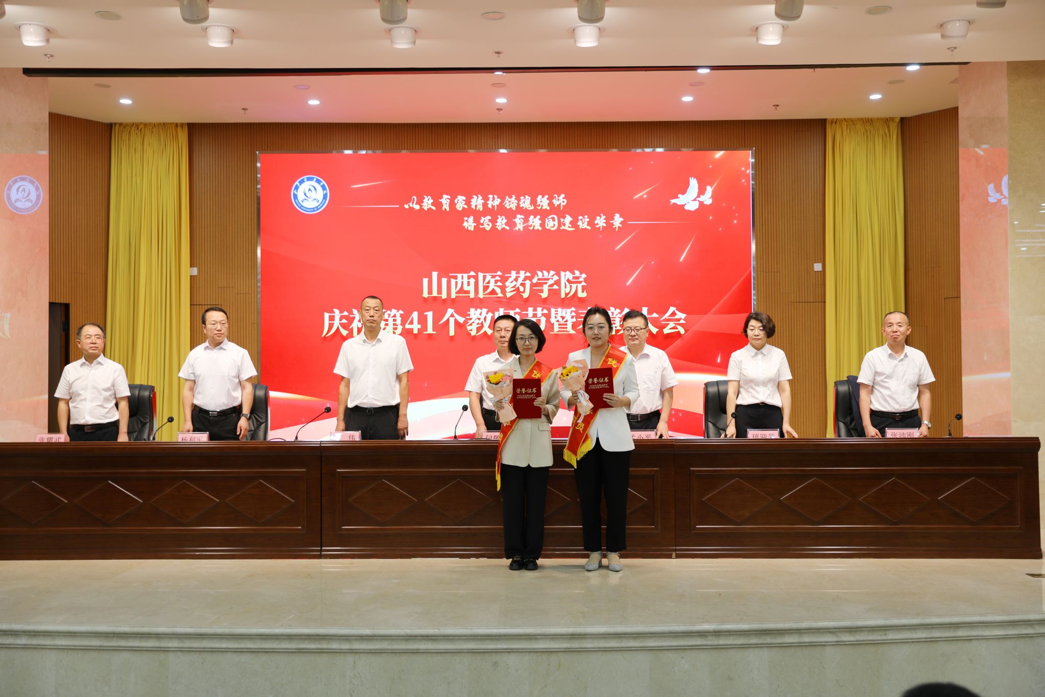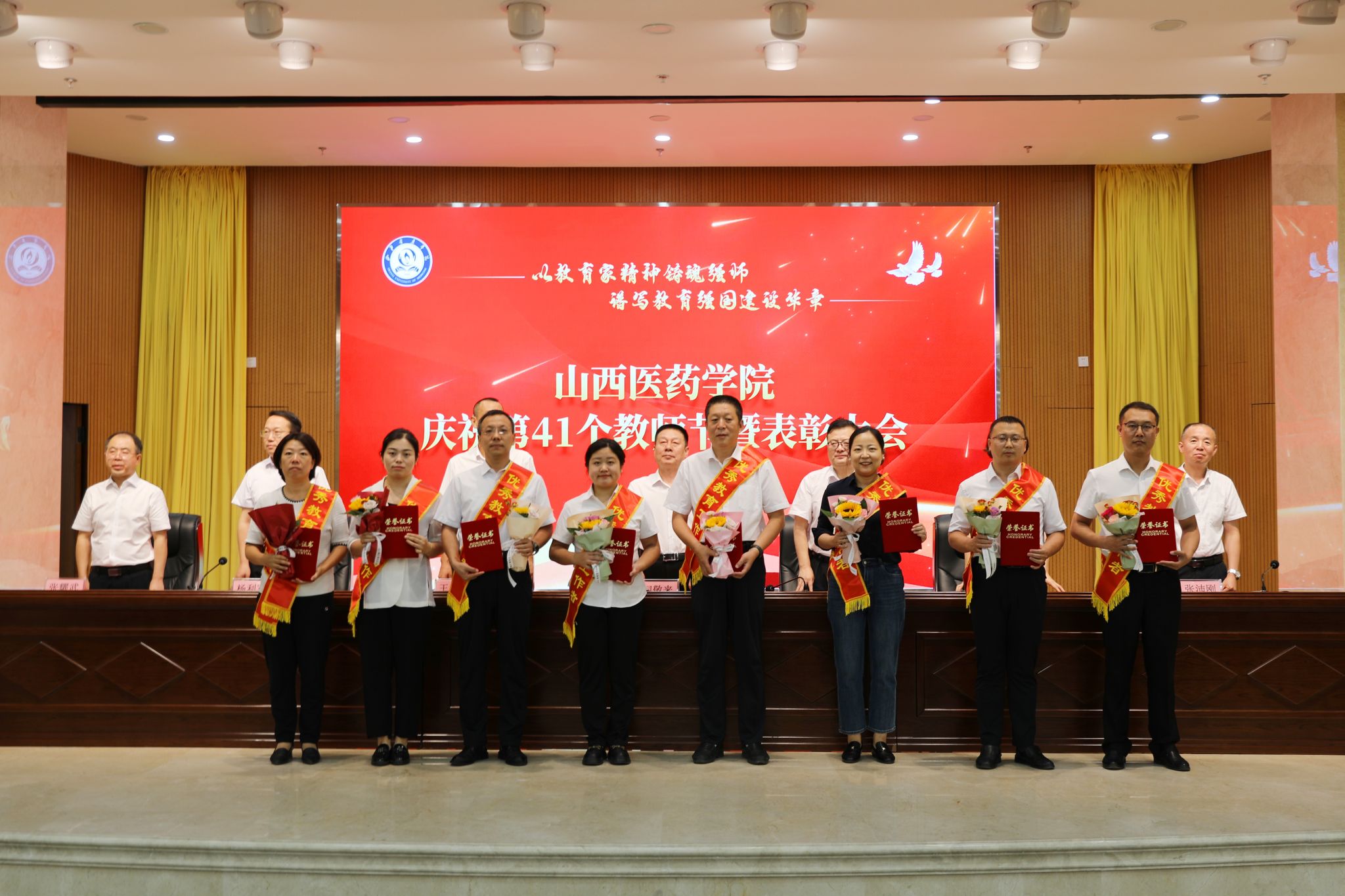 9月9日,beat365举行庆祝第41个教师节暨表彰大会。党委书记闫敬来,党委副书记、院长孟小平,党委副书记王伟,党委委员、纪委书记顼迎芳,党委委员、副院长杨利军,山西省汾阳医院党委书记张沛刚,党委副书记、院长张耀武出席,学校中层干部、新入职教师、获奖个人及获奖集体代表、师生代表参加。王伟主持。