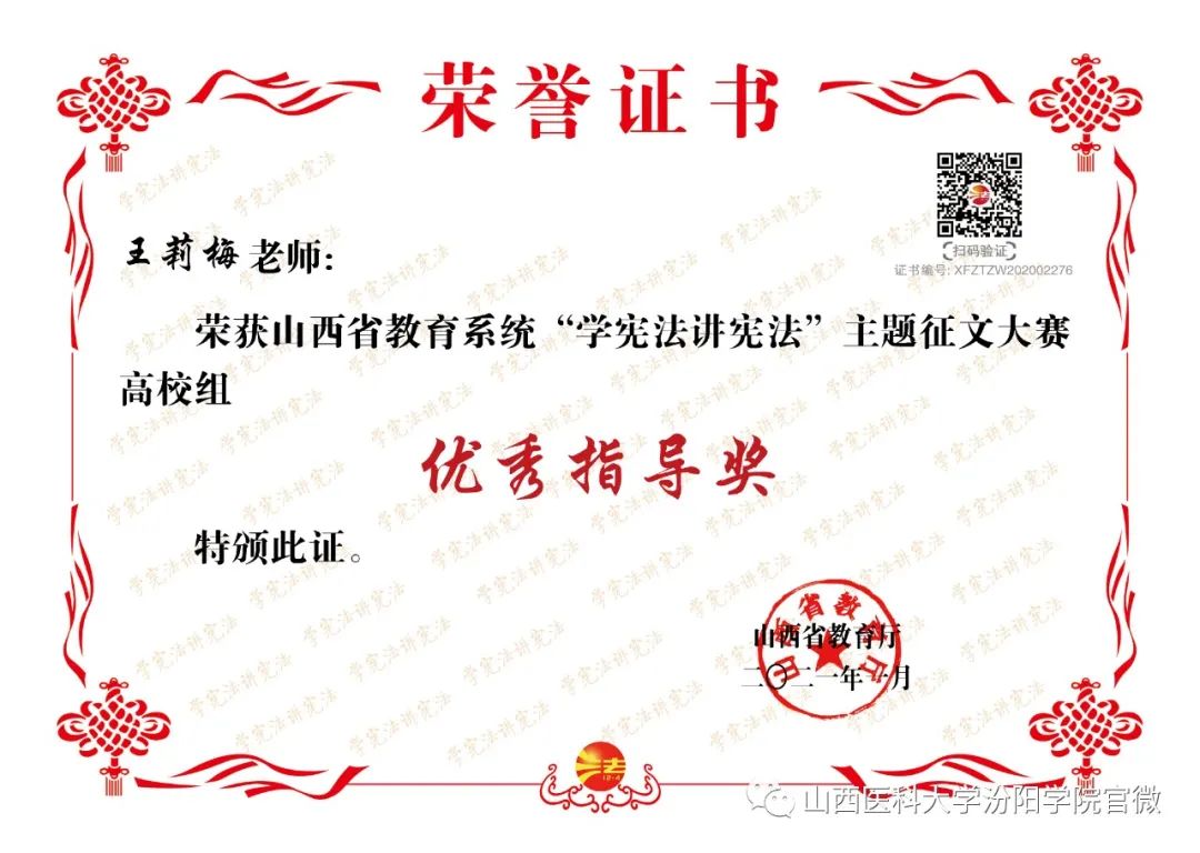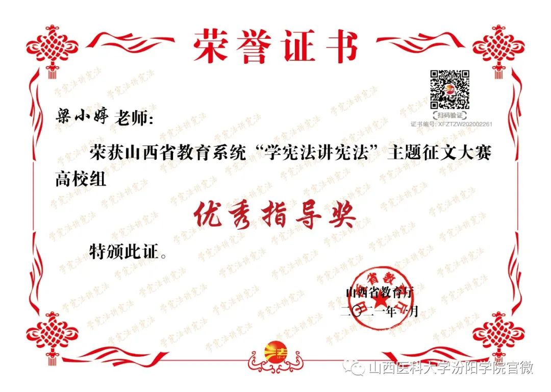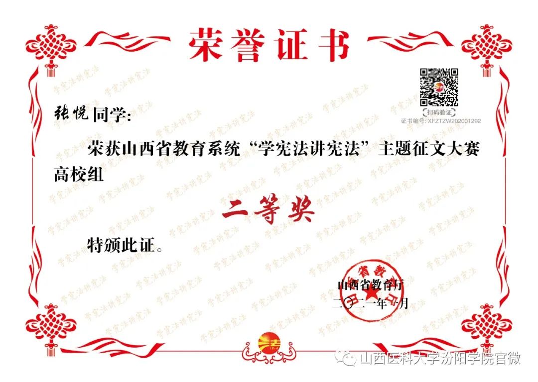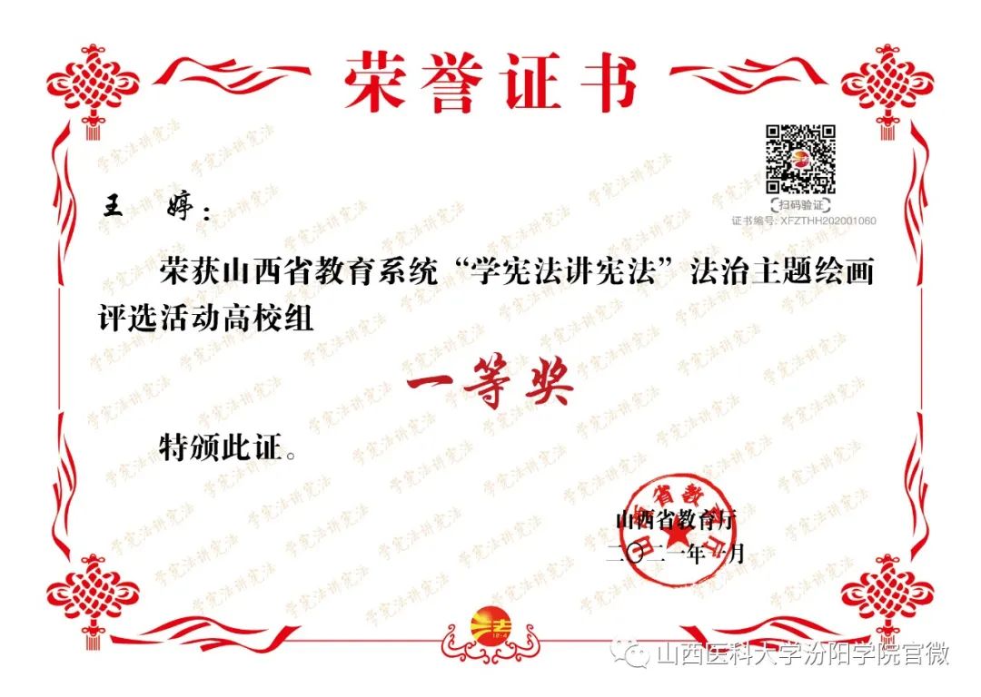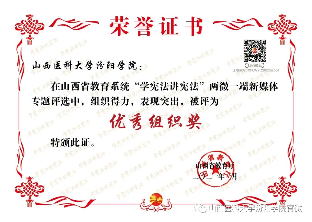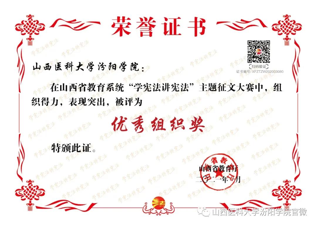 近日,2020年山西省教育系统“学宪法讲宪法”主题系列活动的结果公布,beat365喜获佳绩。其中,beat365选送的主题征文作品荣获高校学生组一等奖1个、二等奖2个、三等奖4个,优秀指导老师奖6个,同时beat365荣获优秀组织奖;校报《汾阳学院》荣获校报(刊)主题内容(版面)设计大赛二等奖,同时beat365荣获优秀组织奖;法制主题绘画作品荣获高校组个人奖项一等奖;“我与宪法”微视频作品荣获高校组二等奖;同时beat365荣获“两微一端”新媒体专题评选活动优秀组织奖(具体名单附后)。