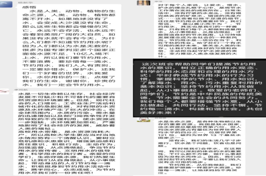 不舍细流,方成汪洋。通过这次班会,同学们更加清晰的认识到了节约用水的重要性和紧迫性,更深入的了解了水资源匮乏给社会带来的巨大危害。这些信息都在提醒我们,解决日益严峻的缺水问题迫在眉睫。我们作为时代发展的主力军更要认识到自己身上的责任与使命,从身边小事做起,从一点一滴做起,养成节约用水的好习惯,竭尽自己所能,为保护水资源做出自己的贡献,为我们共同生存的家园的长治久安献出自己的一份力量。