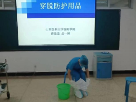随后岳一婷老师进行了现场实操演练,从用物准备、穿脱步骤、卫生手消毒细节以及注意事项等方面为大家进行了演示,并对穿脱过程中的重点细节着重做了强调。在穿脱过程中,岳一婷老师通过与在场师生互动提问,为其答疑解惑,使现场气氛热烈,加强了老师和同学们对穿脱流程的理解,使大家更加熟悉防护流程,从而提高了大家的应急能力并增强了防护意识。