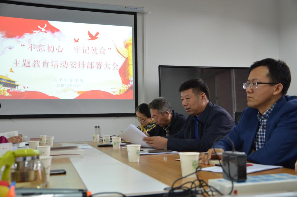 2019年9月19日,电子信息学院在电信楼302会议室召开“不忘初心,牢记使命”主题教育活动安排部署大会。学院党政领导、党委委员和全体支部书记参加了会议,联系校领导朱永民副校长参加并作讲话,会议由学院党委书记杨恩科主持。会上,杨恩科首先宣读了《必赢优惠y272net关于开展第二批“不忘初心、牢记使命”主题教育的实施方案》,对必赢官网此次主题教育活动的目标要求和具体安排做了详细的传达。接着,杨恩科结合学校的总体要求就学...