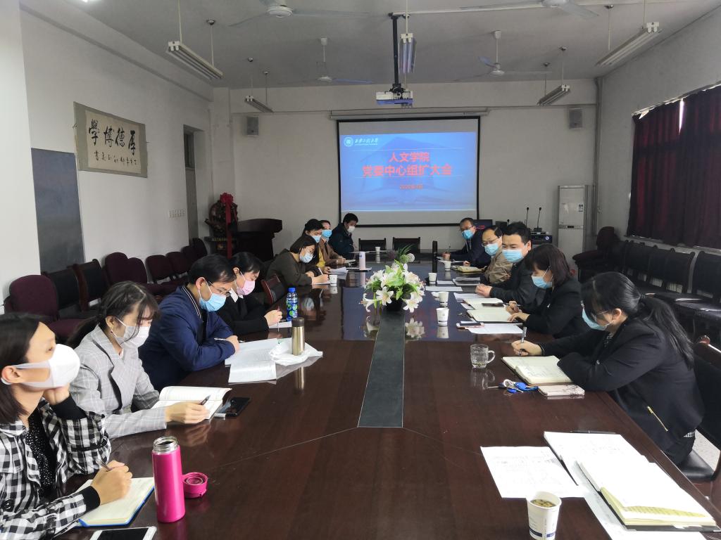 2020年4月17日下午,人文学院党委召开理论学习中心组扩大会议,会议由徐利兰主持,人文学院班子成员、党委委员、工会主席、系部室中心主任参加,校党委副书记赵小锋参加会议。本次会议的主要议题是研讨交流学院2020年重点工作。首先,校党委副书记赵小锋就学校线上开学以来防疫抗疫各阶段重点工作、存在问题进行了梳理和通报,并对学院后续防疫抗疫和教学科研两不误提出了希望和要求。随后,赵小锋副书记详细通报并解读了学校20...