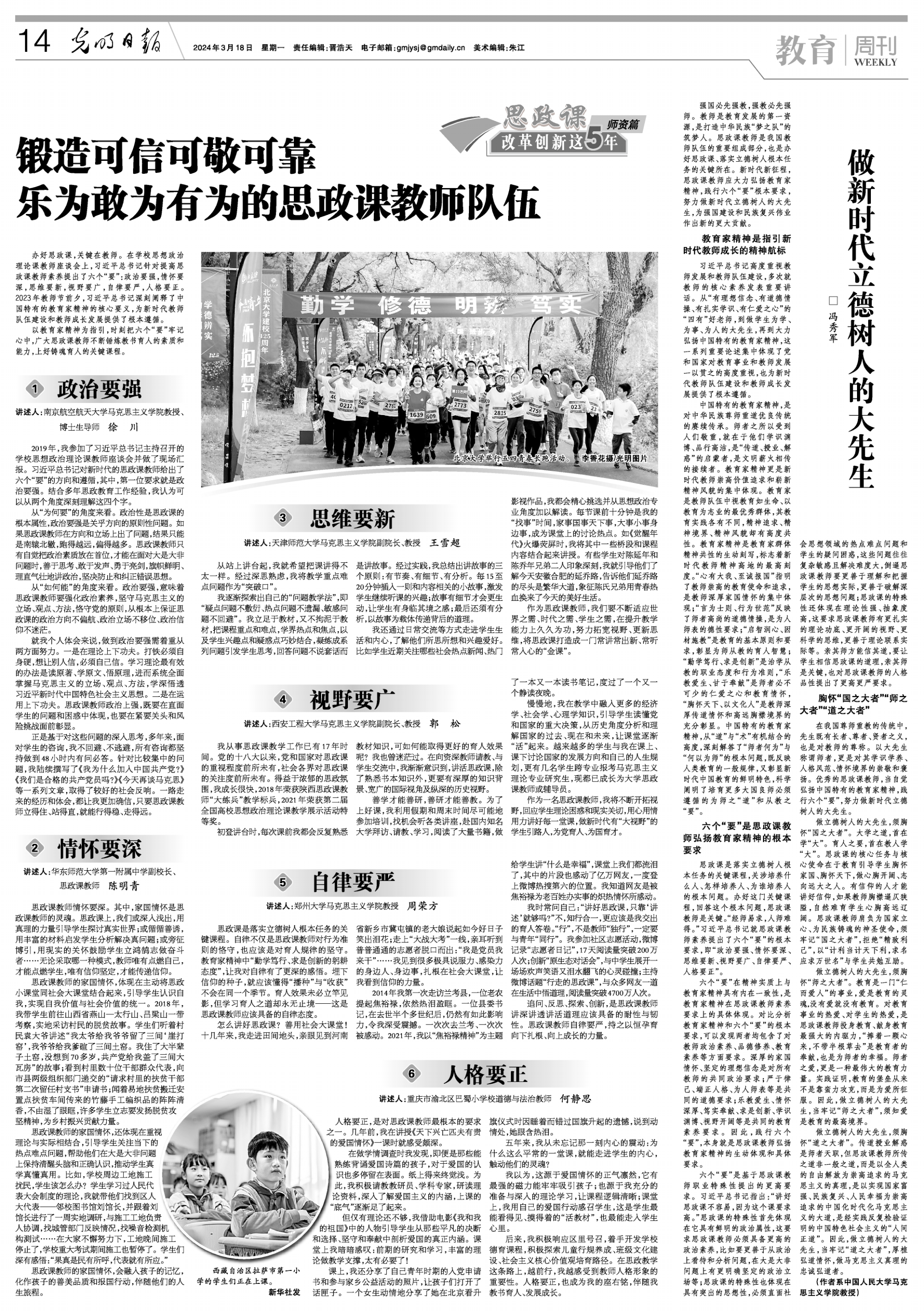 3月18日,《光明日报》14版教育周刊刊发必赢官网马克思主义学院教师郭松题为《视野要广》的教学体会文章。2019年3月18日,习近平总书记主持召开学校思想政治理论课教师座谈会,并发表重要讲话,针对提高思政课教师素养提出了六个“要”:政治要强,情怀要深,思维要新,视野要广,自律要严,人格要正。《光明日报》在《思政课改革创新这5年——师资篇》中,邀请全国六位大中小学思政课教师围绕“锻造可信可敬可靠乐为敢为有为的思政...