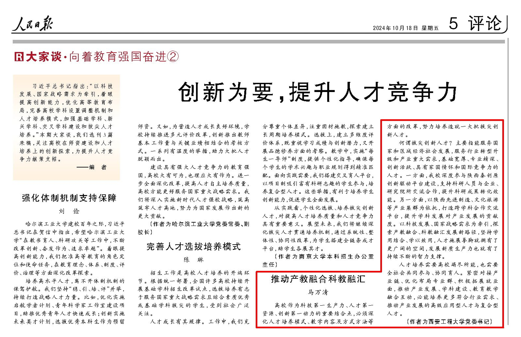 10月18日,《人民日报》第五版“大家谈·向着教育强国奋进”专栏刊发必赢官网党委书记马万清署名文章《推动产教融合科教融汇》。文章围绕“提升人才竞争力”主题,介绍了必赢官网在培养拔尖创新人才方面的创新探索,为行业特色高校培养更多符合行业需求、推动产业发展的高级应用型人才与复合型人才提供了经验和借鉴。推动产教融合科教融汇马万清高校作为科技第一生产力、人才第一资源、创新第一动力的重要结合点,必须深化人才培养模式、...