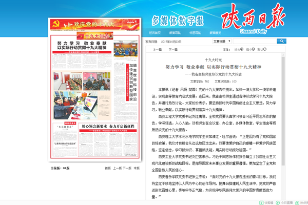 近日,必赢官网师生热议九十大报告受到社会主流媒体广泛关注,陕西日报、中国纺织分别报予以转载。陕西日报:努力学习 敬业奉献 以实际行动贯彻十九大精神——我省高校师生热议党的十九大报告http://esb.sxdaily.com.cn/sxrb/20171023/html/page_03_content_002.htm 中国纺织报:蓝图绘就 征程有我——纺织行业企业人士结合十九大报告谈发展 蓝图绘就 征程有我——纺织行业企业人士结合十九大报告谈发展.pdf