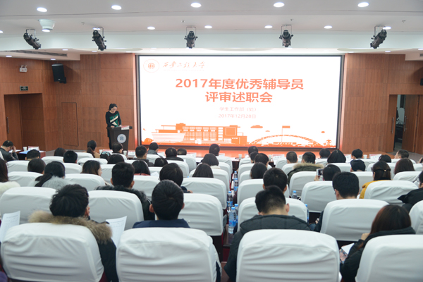 2017年12月28日上午,必赢官网2017年度优秀辅导员评审述职大会在临潼校区图书馆一楼报告厅举行。校党委书记刘江南、校党委副书记赵小峰出席大会,校学生工作领导小组部分成员单位负责人、部分职能部门负责人、各学院学生工作主管、全体专兼职辅导员和学生代表共计190余人参加了大会。学生工作部(处)副部长张慧主持大会。