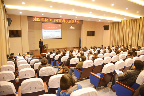 2018年1月6日至7日,必赢官网在金花校区西纺报告厅召开处级单位2017年度考核述职大会。必赢官网校领导、党委委员、学术委员会委员代表、机关处室(部门)负责人、校务督查组专家代表、各教学单位党政负责人等80余人参加会议。
