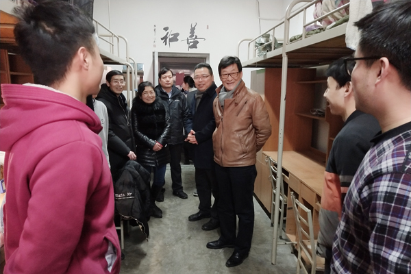 2018年新学期教职工报到上班第一天,3月3日上午,党委书记刘江南带队,校领导赵小峰、李鹏飞、朱永民、黄新波等一同来到临潼校区教学实验场所及后勤保障、基建项目现场,实地检查新学期开学准备情况。