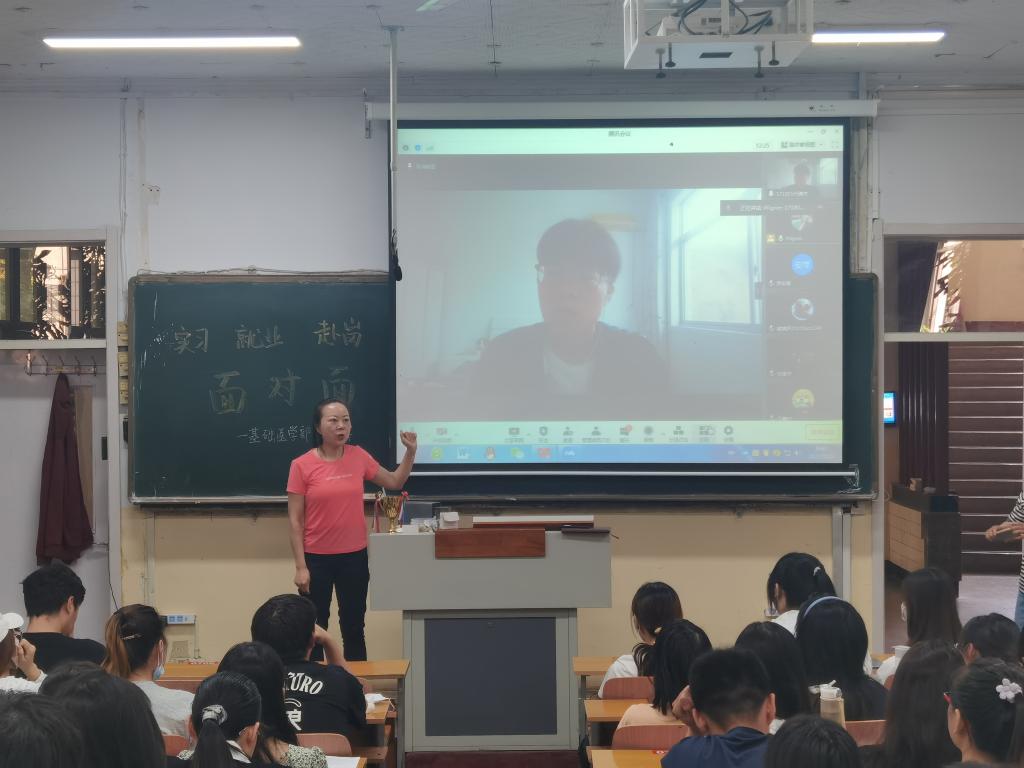 在实习和毕业交替之际,为进一步做好就业工作,使同学们更好地了解实习以及疫情形势下的就业形势与政策,促进同学们尽快适应新生活,实现从学校到临床的过渡,更好地践行个人职业规划,做好实习与就业准备,5月27日上午9时,基础医学部党总支书记姚万军走进即将奔赴实习的医学实验技术专业171901-4班,同时网络连线2022届毕业班171801-2同学, 线上线下同步作了“实习、就业、赴岗 面对面”专题讲座。171801-2班班主任董婧妍老师、171901-2班班主任李肃和辅导员张梦君参加。