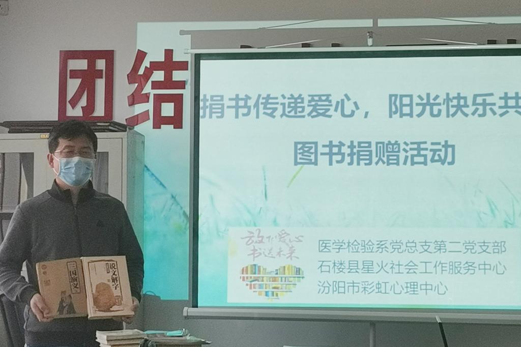 “予人书本,手留墨香,奉献爱心,收获希望”,为使贫困乡村缺少课外阅读的孩子有书读,为有需要的孩子们种下一粒粒梦想的种子,推开一扇扇看世界的大门,4月21日,在世界读书日来临之际,医学检验系党总支第二党支部携手石楼县星火社会工作服务中心、汾阳市彩虹健康心理中心开展为石楼县小朋友“捐书传递爱心、阳光快乐共读”的图书捐赠活动。