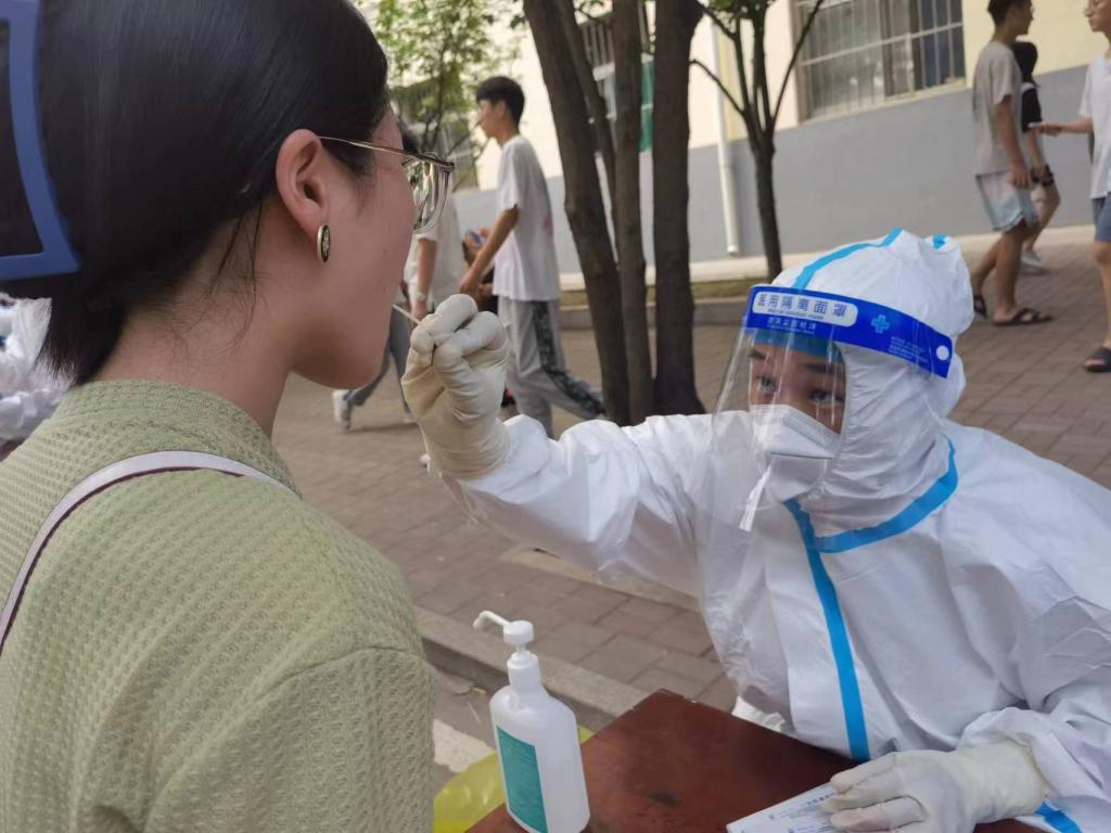双手消毒、取出棉签、擦拭咽喉、拔掉棉签尾部手接触部位,将咽拭子标本放置于采样管。这样的动作他们不知道进行了多少回。他们是烈日下全副武装的“大白”,他们的脸庞在水雾弥漫的防护面罩下视线模糊,他们的双手紧攥棉签……他们是65名来自学校各部门志愿者组成的一支核酸采样队伍,承接了近8000名在校师生的日常核酸采样任务。