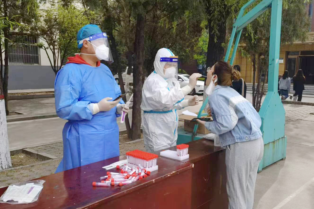 后来是安排校内志愿者的核酸检测任务。因种种原因,汾阳医院的核酸检测人员难以派出,从5月5日起学校立即抽调各系部组成核酸检测队伍,先后有65名志愿者参与了核酸检测工作。65名志愿者中,有系部的副主任,有50多岁的研究生导师,也有刚刚参加工作的年轻老师们……