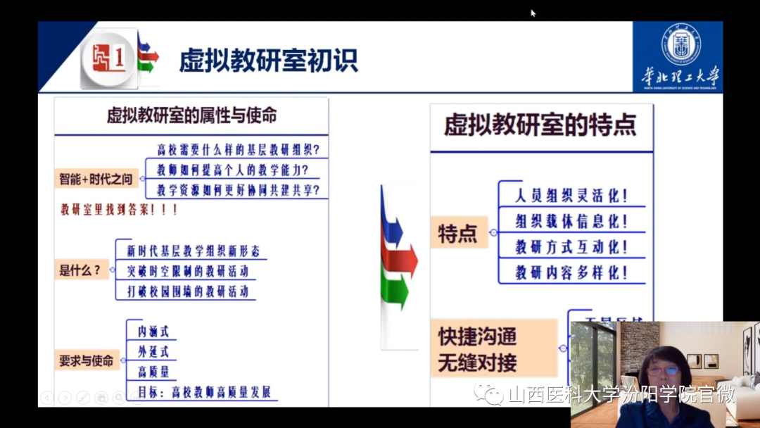 来自北京师范大学、上海交通大学等名校的专家围绕教学方法、教学创新、教学设计、学习评价和虚拟教研五个方面展开了精彩的讲授。张萍教授在《基于翻转课堂的同伴教学法》讲座中系统分析了传统教学方法的利弊,提出了新时代教师发展和人才培养的新要求和重要使命,就是培养具有创新能力与合作精神的人才。许亮教授在《信息化背景下教学创新设计的思考与实践》讲座中讲授了信息化BYOD教学手段的合作学习模式与科学评价机制。周付安教授在《教学设计:从朴素经验到效能可期的三层跃迁》讲座中提出了教学设计对教材内容的重构和对学生从知识到能力与情感的跃迁。邱意弘教授在《学习评价:课堂学习效果评价》讲座中介绍了医学教育的评估框架和评估方法。信息化的教学手段催生了教研室这一基层教学组织的新变革。刘春凤教授在《虚拟教研:从大学数学课程建设到虚拟教研室建设的跋涉之旅》讲座中以华北理工大学大学数学课程群虚拟教研室的构建为范例,介绍了虚拟教研室的建设理念与行动方案。