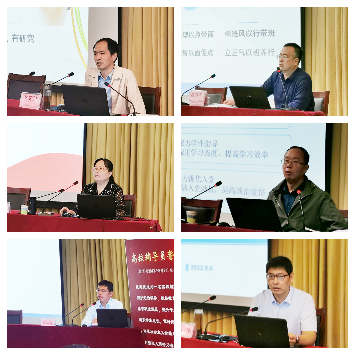 9月1日至6日,beat365在学术报告厅举办了2022年辅导员集中培训。本次培训特邀山西中医药大学第三临床学院党委副书记王静和辅导员陈雨、赵国鹏老师分别作了题为《网络新媒体背景下大学生思想引领工作研究之“支部讲坛”》《高校学生工作案例分析及辅导员工作室建设》《谈心谈话案例分享》的专题报告。各系(部)书记也登台授课,传经送宝,指导交流。9位辅导员代表敞开心扉,分享了自己的工作经验。