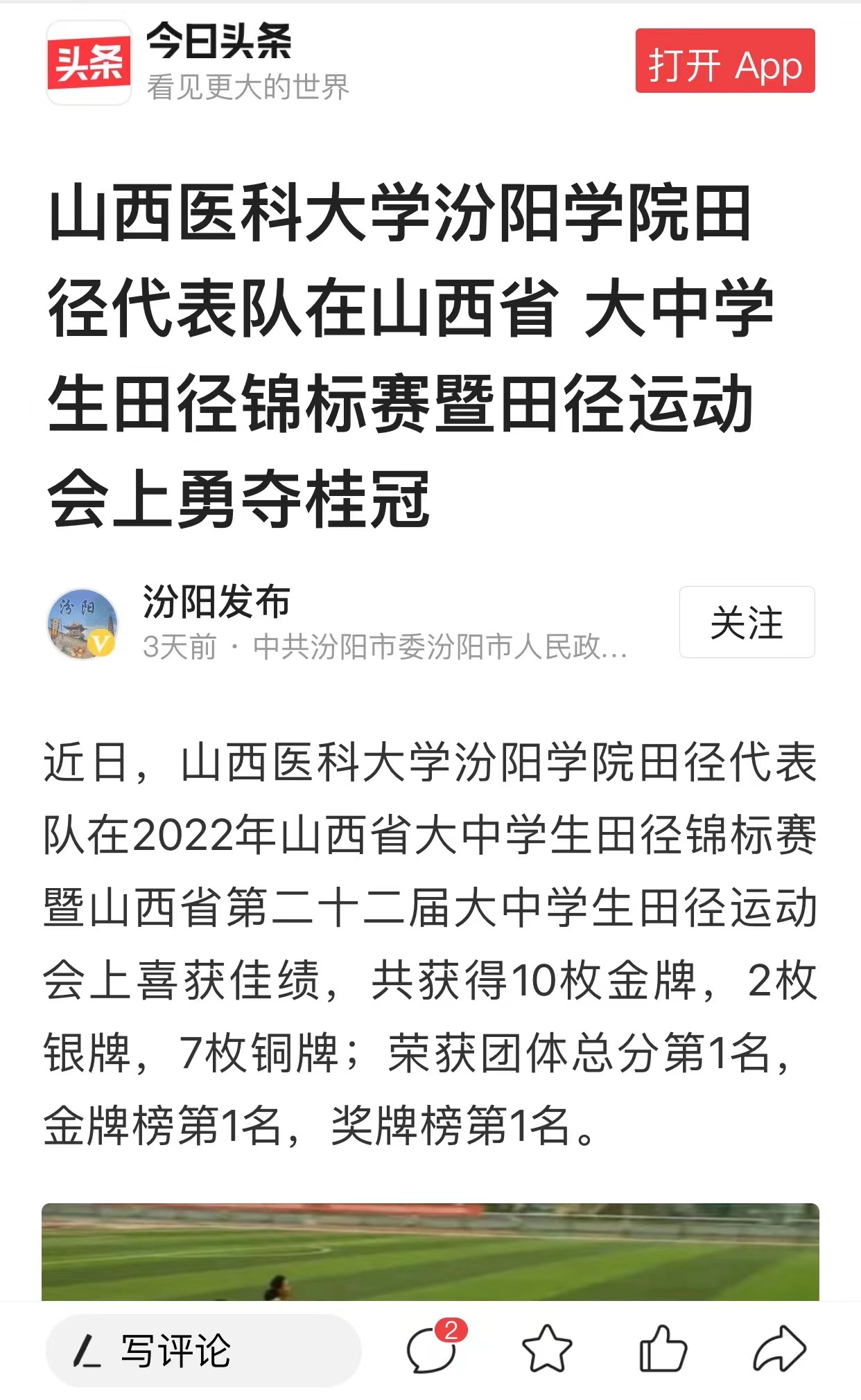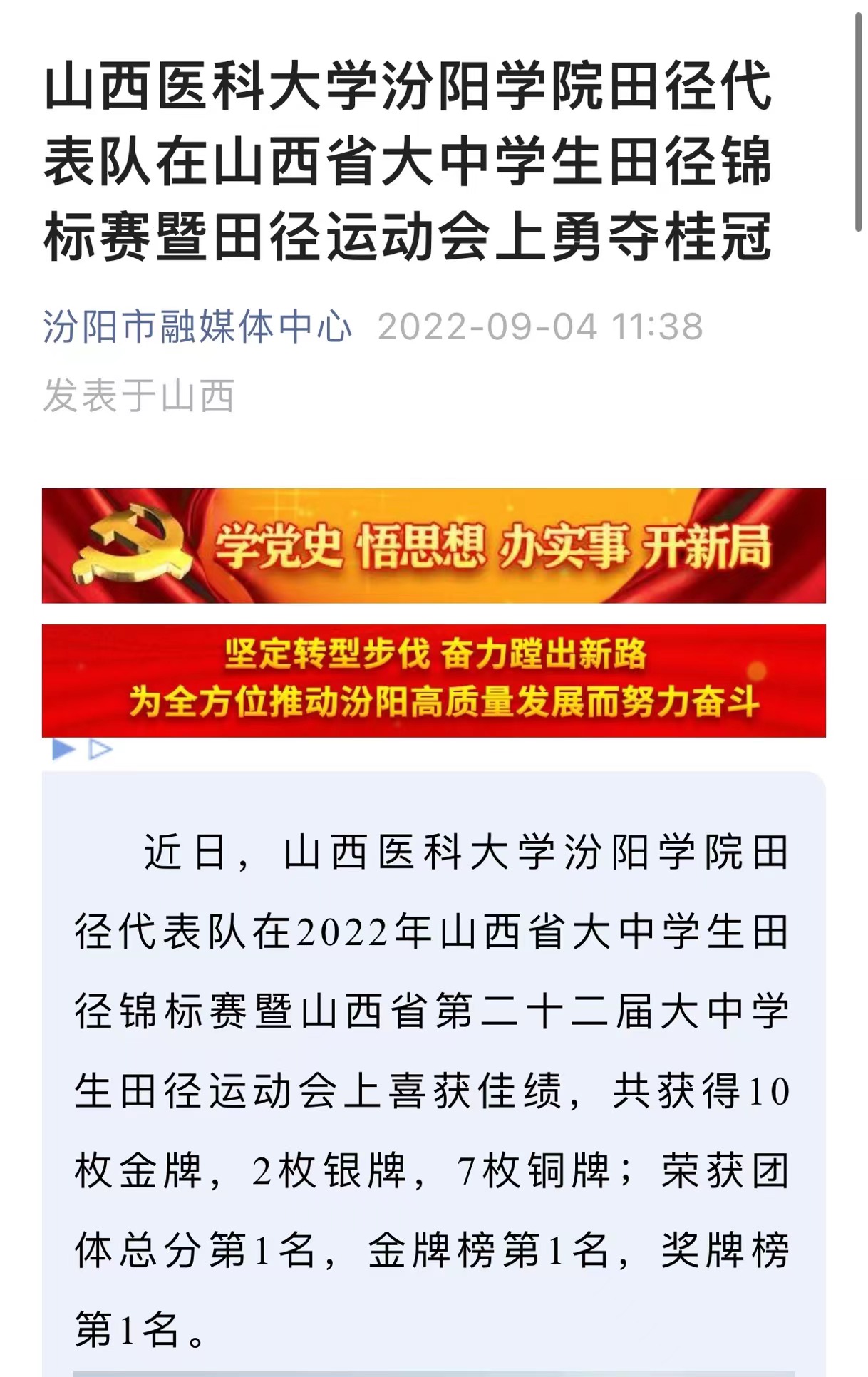近日,beat365田径代表队在2022年山西省大中学生田径锦标赛暨山西省第二十二届大中学生田径运动会上喜获佳绩,共获得10枚金牌,2枚银牌,7枚铜牌;荣获团体总分第1名,金牌榜第1名,奖牌榜第1名,取得了学校历史上的最好成绩。喜讯传来,师生奔走相告,同时也得到各级媒体的广泛关注。人民日报、山西日报、今日头条、汾阳市融媒体中心等多家新媒体平台对此进行了报道,提升了beat365的影响力和美誉度。