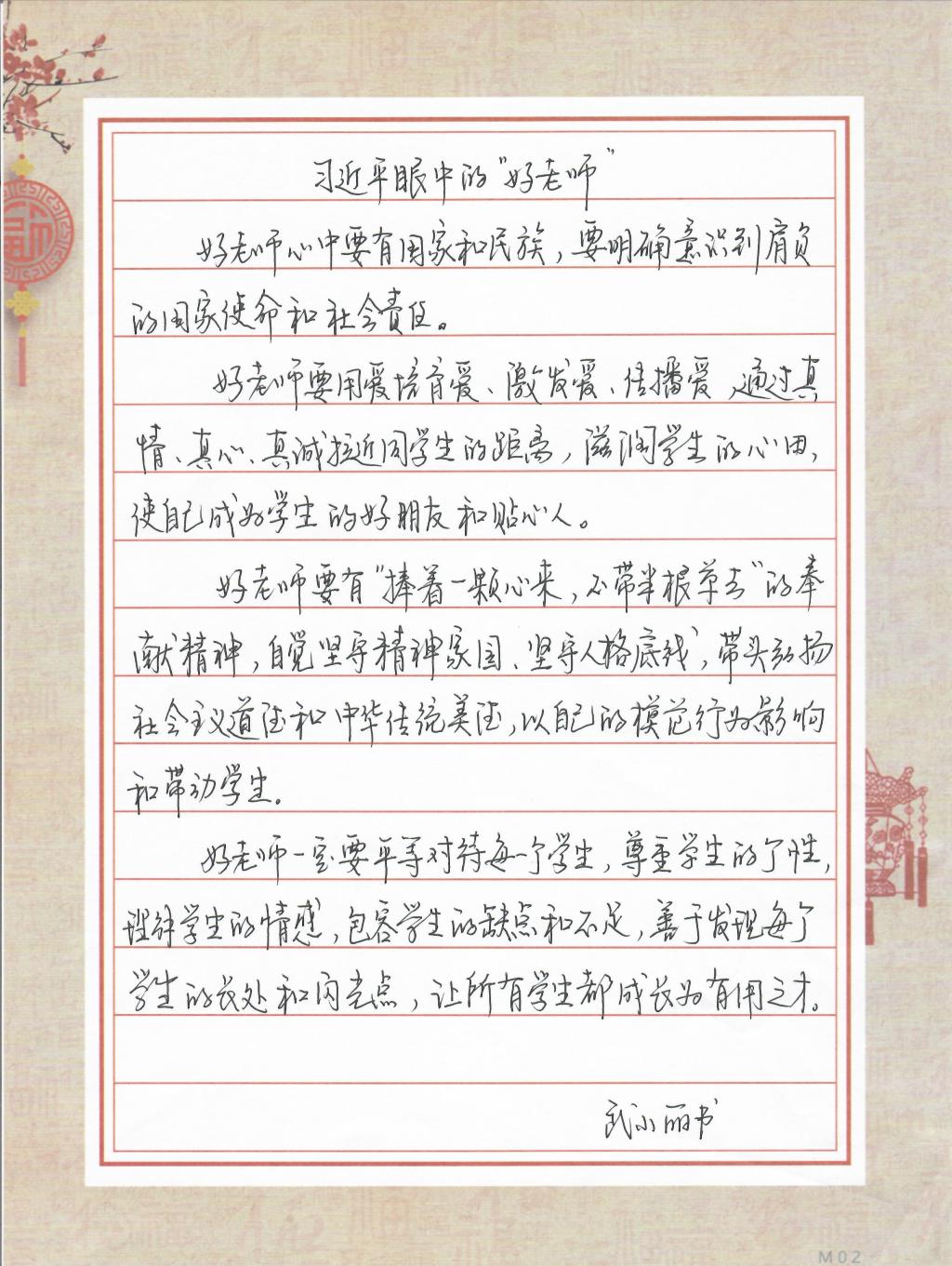 品文字之美,享书写之乐。硬笔书法比赛老师们积极参与,共收回作品38幅。一俯一仰挥翰墨,一撇一捺写春秋。老师们的书法作品有的正直平稳、刚劲飘逸;有的玲珑娟秀、韵味十足。一笔一画,一横一竖,每幅作品可见一丝不苟的态度和严谨求实的作风。书到深处见文化,评审小组从书写规范、结构合理、章法自然、美观大方等方面进行了评选,评出5幅一等奖作品,8幅二等奖作品,12幅三等奖作品。