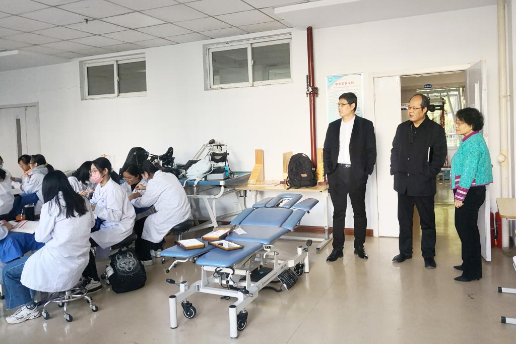 在眼视光学系,校党委委员、纪委书记尹锡昊走访调研了康复治疗学实训中心、眼视光学实训中心,详细了解了系部概况、学科专业建设等基本情况和实验室的整体构架、运行情况和安全状况。他强调,要把学习贯彻党的二十大精神与当前的教育教学、疫情防控、安全稳定等重点工作紧密结合起来,紧紧围绕学校第四次党代会提出的“1359”行动方案,进一步加强省一流专业建设,优化人才培养方案,不断提升教育教学水平,推动眼视光学系发展迈上新台阶。