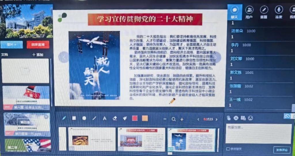 思政课教师们依托课堂主渠道,结合学生实际,通过学习通、腾讯会议等平台,分专题、成系列,利用每次课前时间,用学生听得进、听得懂的语言开展专题宣讲,教育引导广大学生坚定理想信念,锐意拼搏进取,热情拥抱新时代,与国家发展同行,与民族复兴共进。接下来,思政课教师将继续担负起党的二十大精神的学习者、传播者、实践者的角色,将理论宣讲与社会实践结合起来,创新方式方法,切实把党的二十大精神讲深、讲透、讲活,提升思政课的凝心铸魂育人成效。