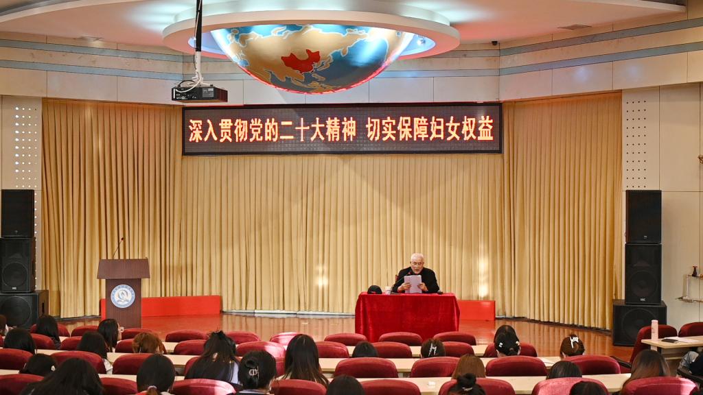 3月8日下午,为了深入贯彻落实党的二十大精神,认真学习宣传贯彻新修订的妇女权益保障法,提高全校女性师生法治意识和依法维护妇女权益的能力,校妇女联合会和校工会女工委,特邀法律专家、“全国青少年普法教育优秀辅导员”张恩柱老师为大家作妇女权益保障法专题讲座,全校女性师生200余人参加,校妇女联合会主席宋维芳主持讲座。