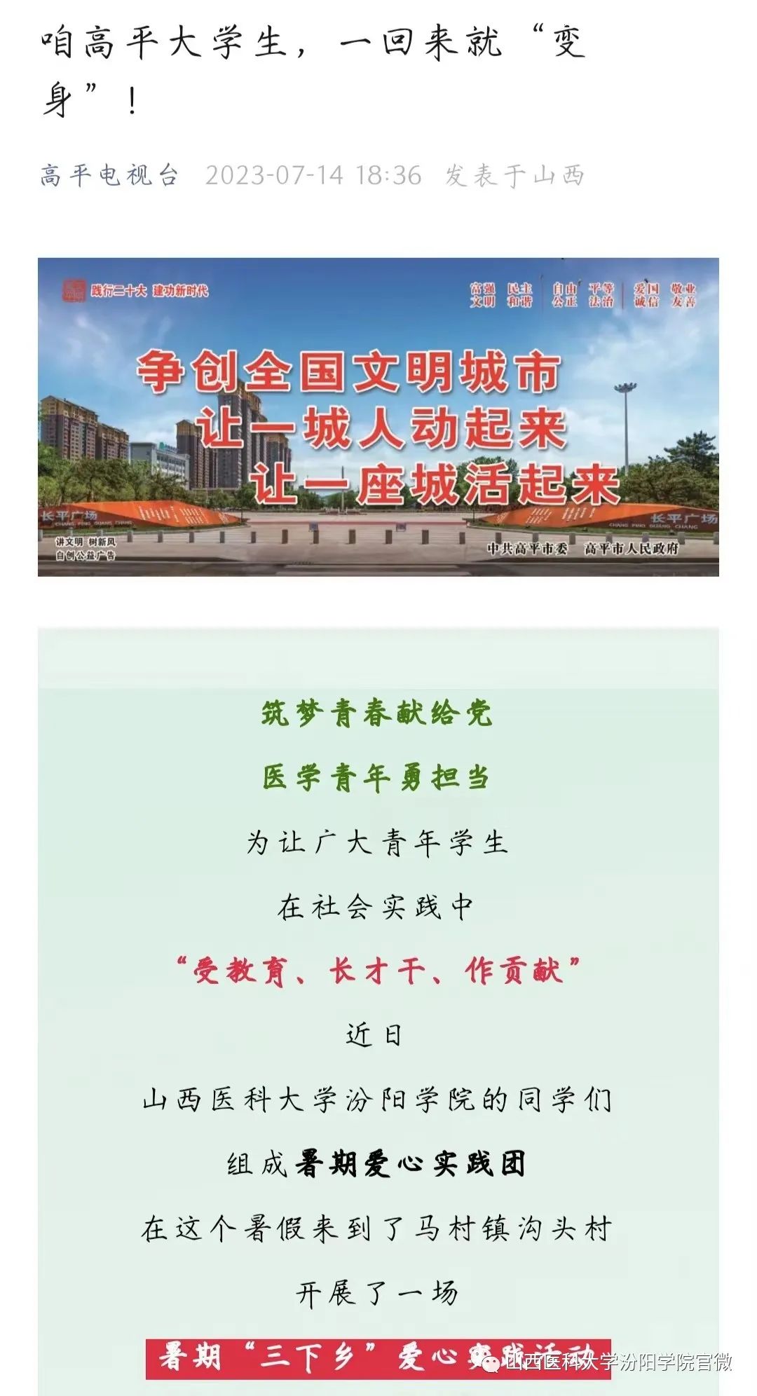 为深入学习贯彻习近平新时代中国特色社会主义思想和党的二十大精神,鼓励学生们在实践中受教育、长才干、作贡献,7月10日至13日,beat36531名高平籍同学在高胜利和赵成瑞老师的带领下,赴高平市马村镇沟头村,开展了为期四天的暑期“三下乡”社会实践活动。