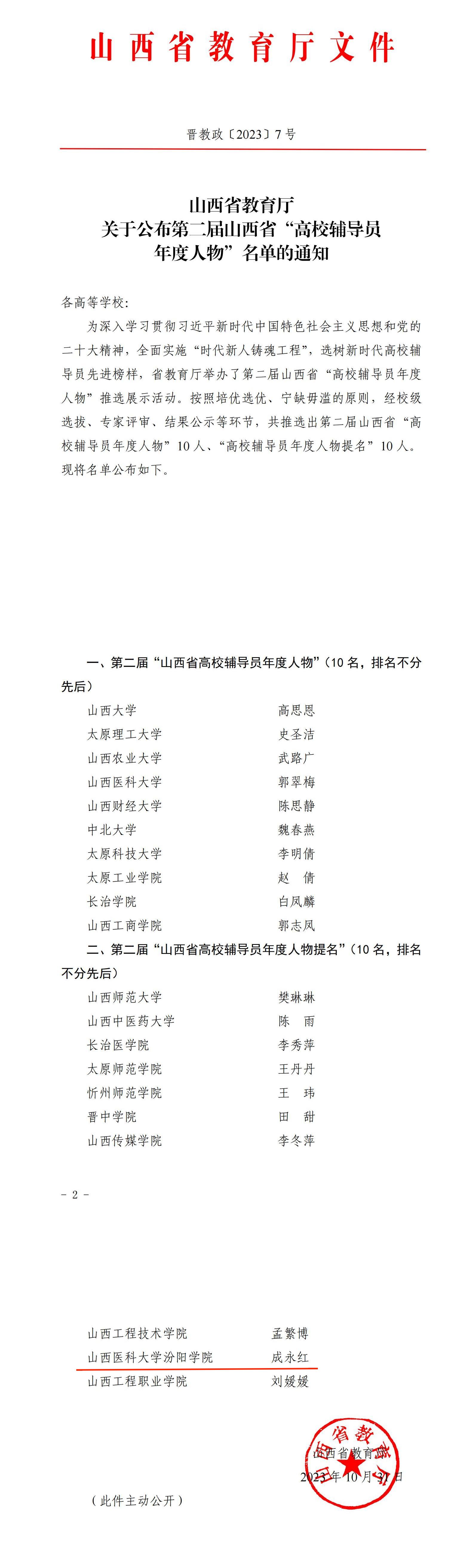 近日,省教育厅公布第二届山西省“高校辅导员年度人物”名单,经校级选拔、专家评审、结果公示等环节,共推选出第二届山西省“高校辅导员年度人物”10人、“高校辅导员年度人物提名”10人。beat365辅导员成永红老师荣获第二届山西省“高校辅导员年度人物提名”。