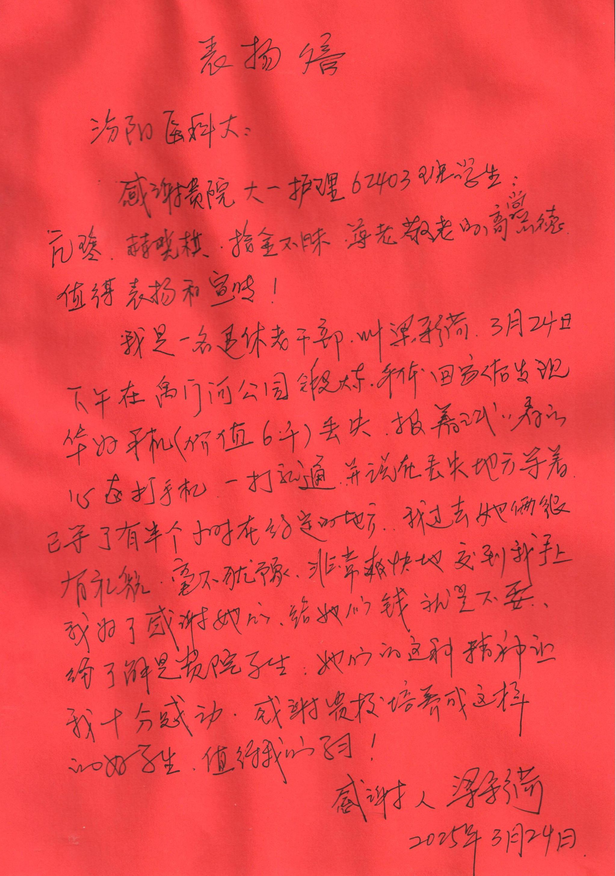 2025年3月24日,beat365护理学系62401-10班的两名学生在禹门河公园捡到了一部价值六千元的手机。面对这笔财物,两位同学心照不宣地共同等待失主。半个小时后,失主向丢失的手机打来电话,双方取得联系。失主赶来后拿出感谢金感谢她们,她们拒绝了。不久后,失主向学校写来了感谢信表扬两位同学的拾金不昧精神。