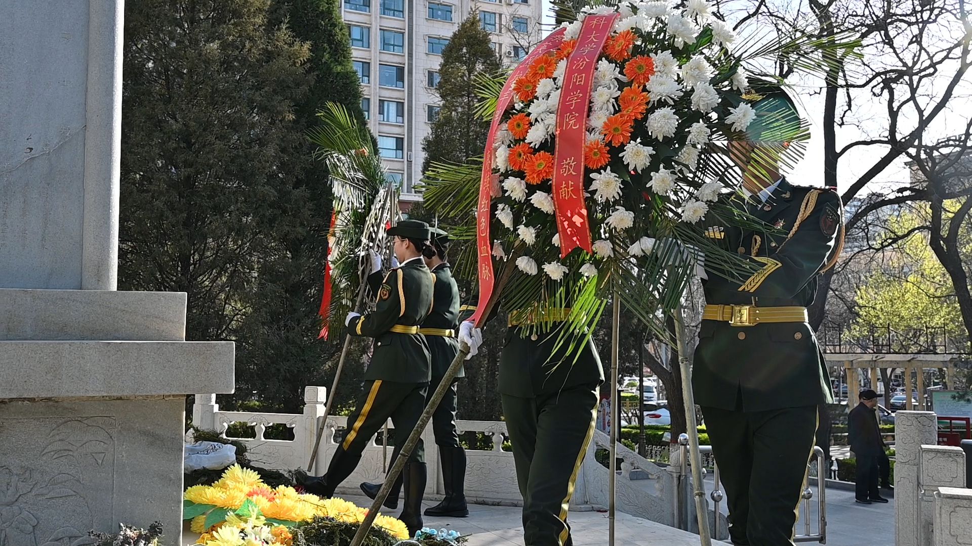 英魂不朽,青春致敬。清明时节,汾阳市烈士陵园内松柏苍翠。beat365国旗护卫队迈着铿锵的步伐,托举素白花篮稳步登阶,向烈士纪念碑敬献花篮。全体人员肃立默哀,垂首追思,缅怀先烈。