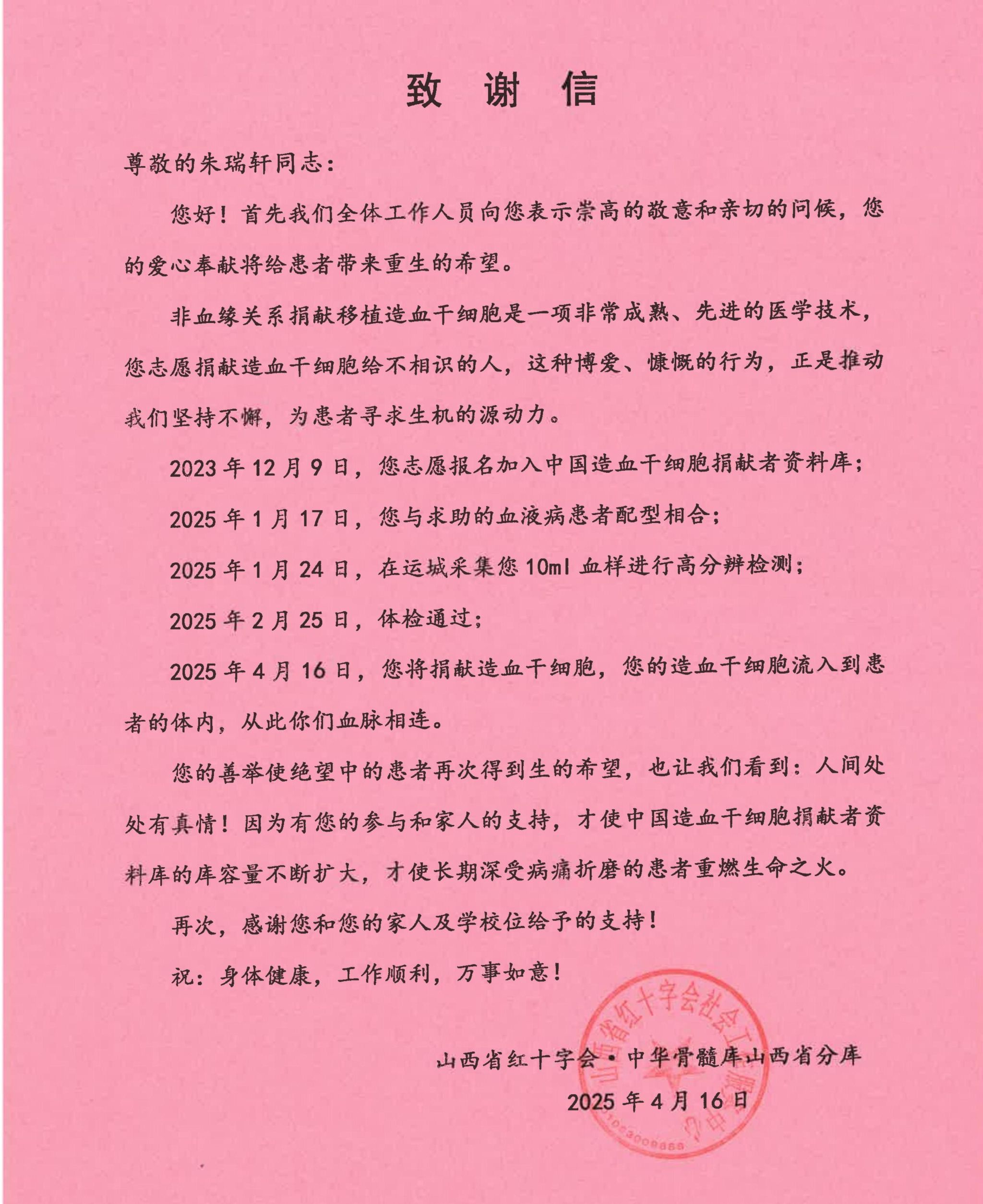 因缘际会,仅仅一年多后朱瑞轩同学就遇到了需要他的人。2025年1月17日,国家管理中心通知山西省管理中心,朱瑞轩同学HLA分型资料与一名16岁的血液病患儿配型吻合。当红十字会工作人员询问朱瑞轩“是否愿意捐献造血干细胞”时,朱瑞轩同学面对突如其来的匹配通知,毫不犹豫同意捐献。在非血缘关系人群中,这种配型的成功率只有十万分之一甚至百万分之一。1月24日,朱瑞轩同学在运城红十字会的协助下采集10ml血样进行高分辨检测;2月25日,体检顺利通过。起初,朱瑞轩同学的母亲担心会伤害朱瑞轩的身体,但是在朱瑞轩同学给她科普造血干细胞捐献相关知识、强调这件事的重大意义后,她选择了支持儿子,做儿子坚实的后盾。