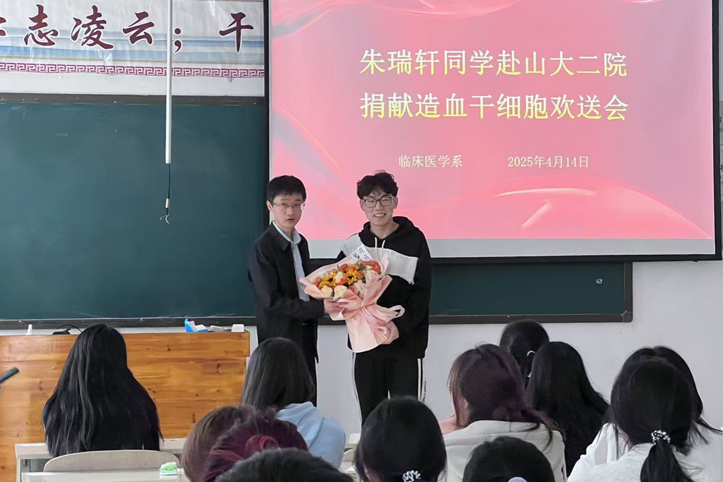 在得知朱瑞轩同学即将赴山西医科大学第二医院进行造血干细胞的采集时,学校党委高度重视,4月14日下午,临床医学系党总支在知新楼第五教室为朱瑞轩同学举办了捐献造血干细胞欢送会。