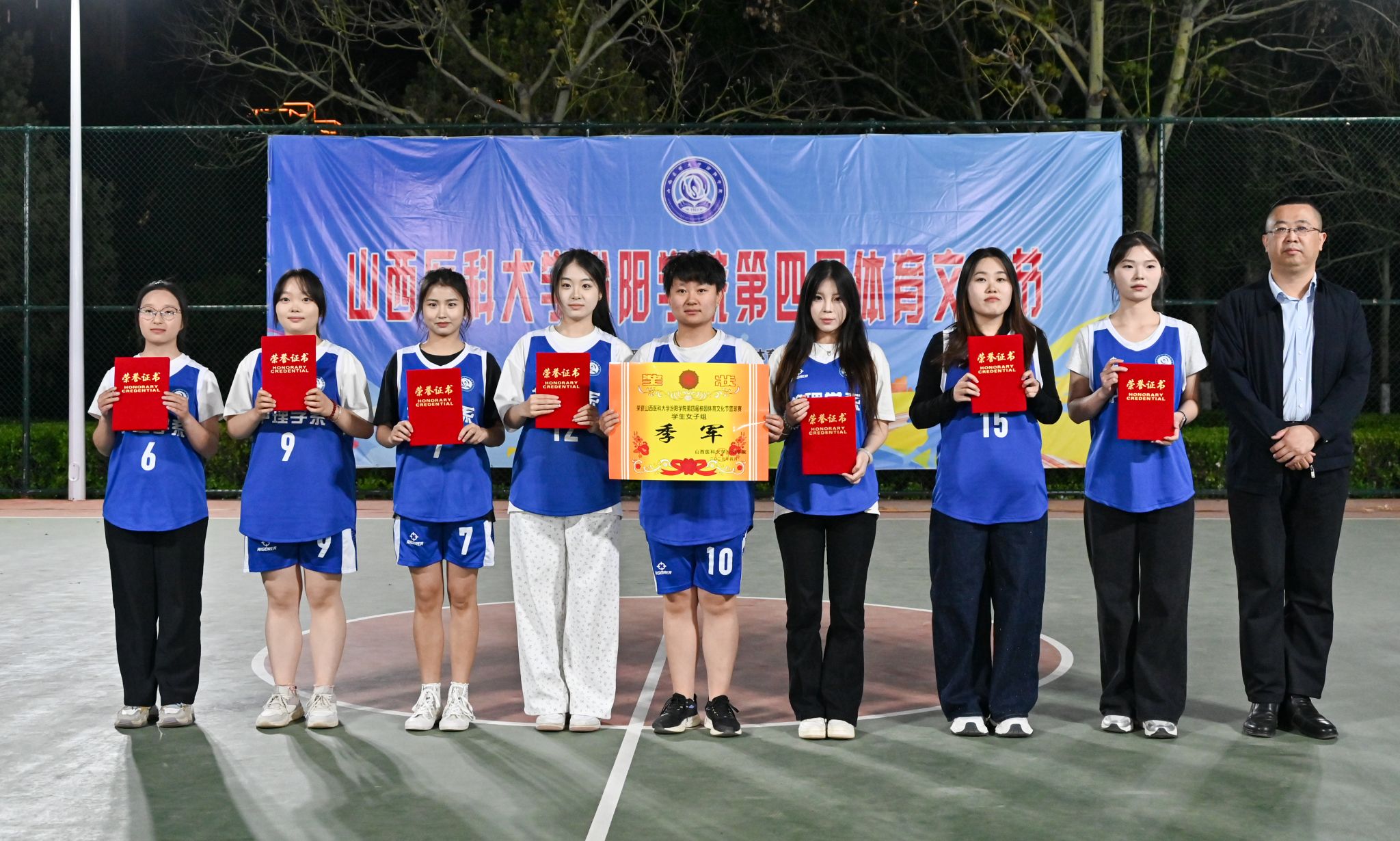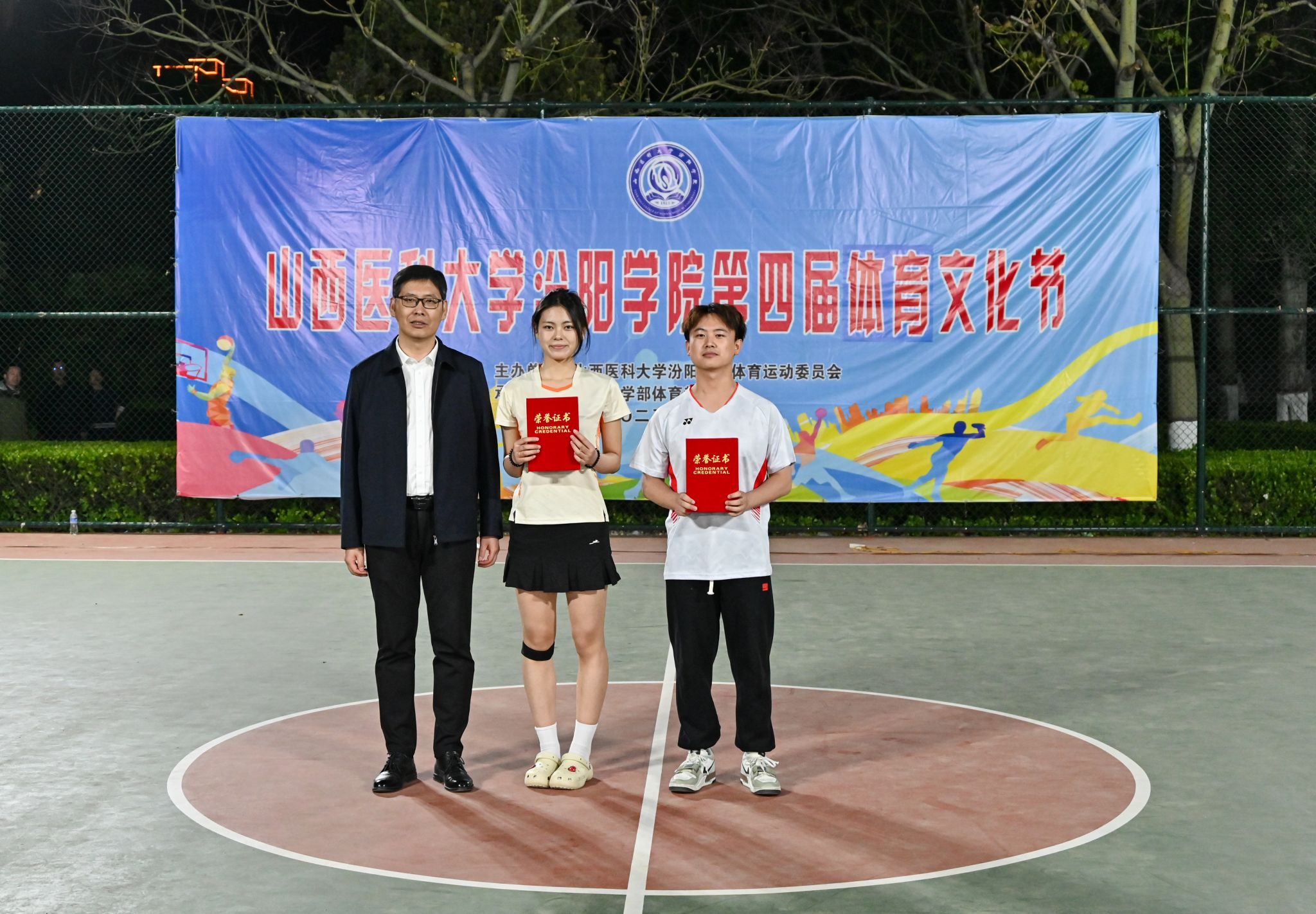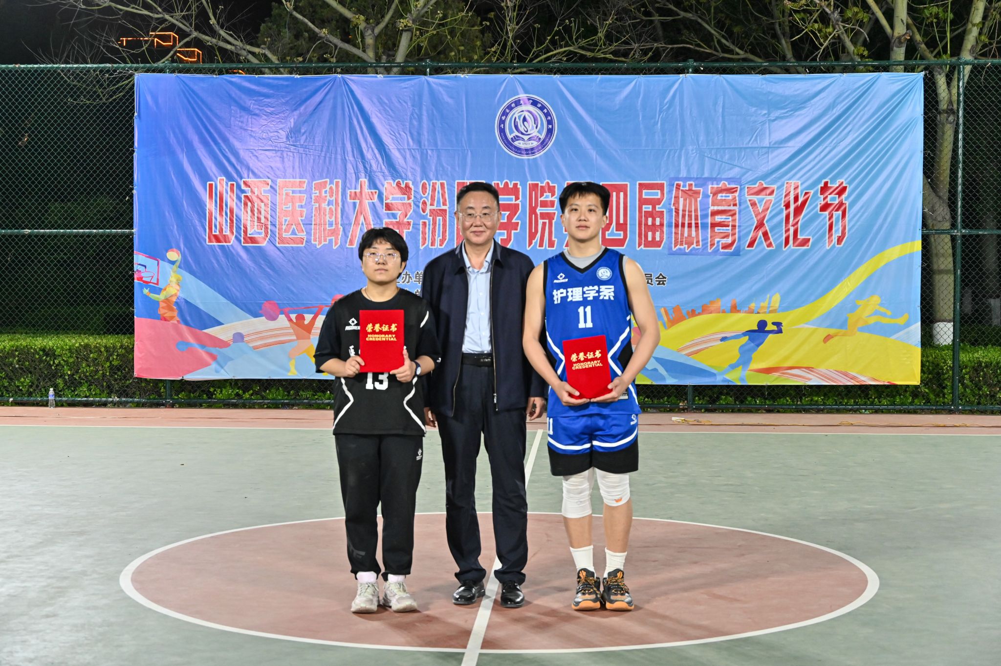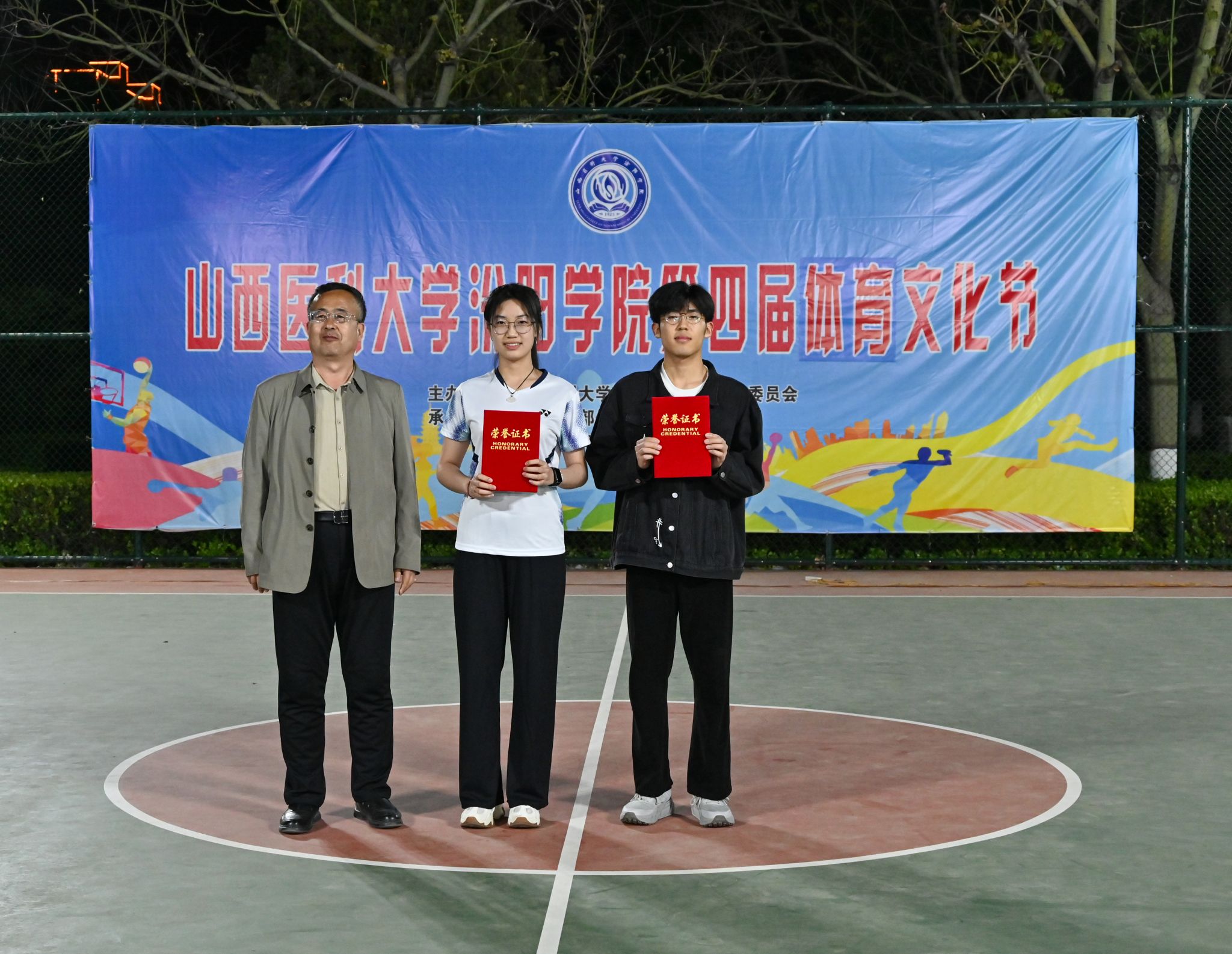 在校体育运动委员会的统筹指导和各系部、相关职能部门的积极配合、全校师生的热情参与和共同努力下,基础医学部体育教研室精心组织的beat365第四届校园体育文化节顺利完成各项赛事,圆满落下帷幕。4月23日晚,闭幕式在篮球场隆重举行。校党委委员、副院长、体育运动委员会主任陈振文,体育运动委员会副主任、基础医学部主任乔海兵,各系部党总支书记、副书记,保卫处、学生工作部、团委等相关部门负责同志出席了闭幕式。