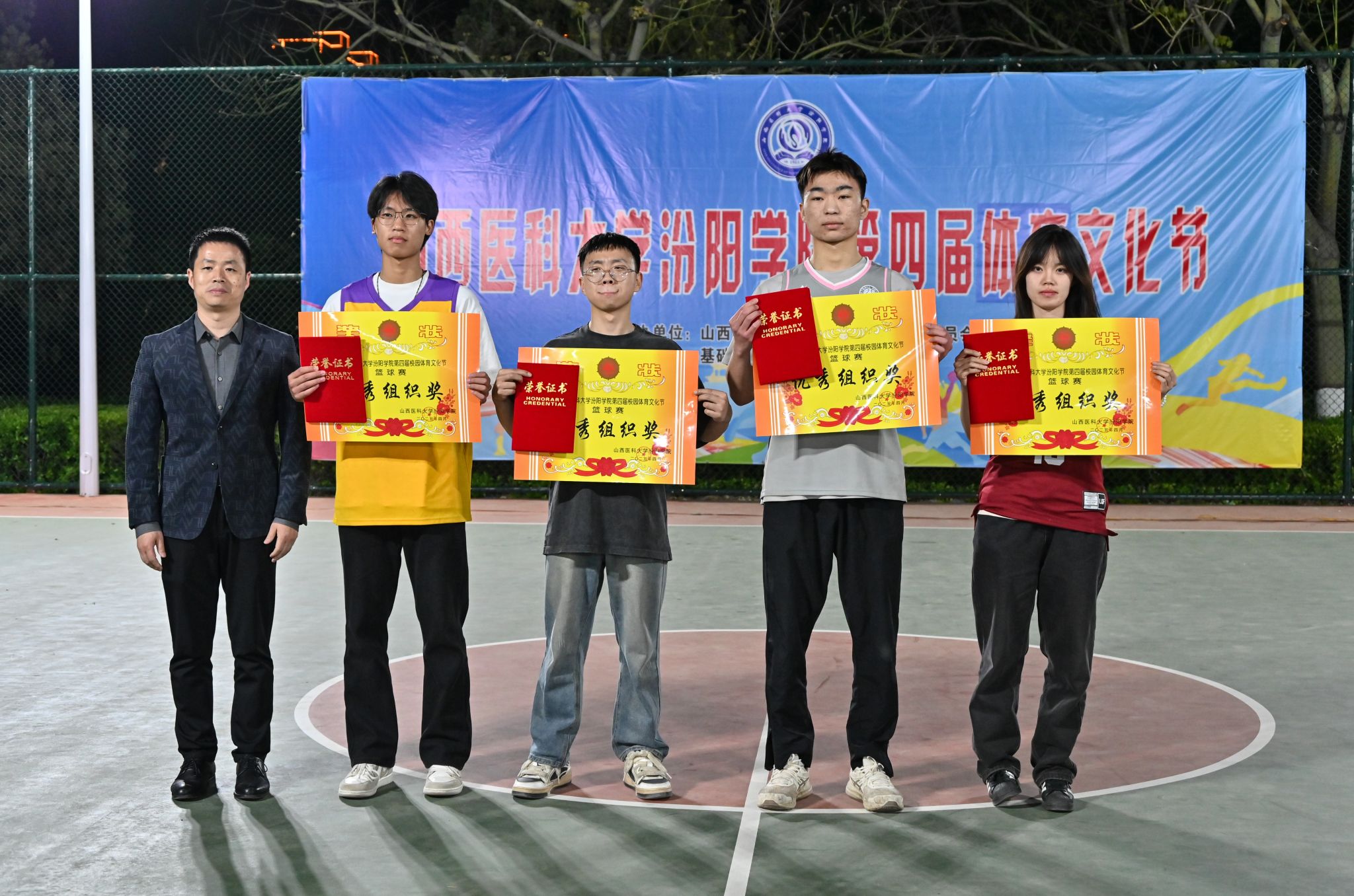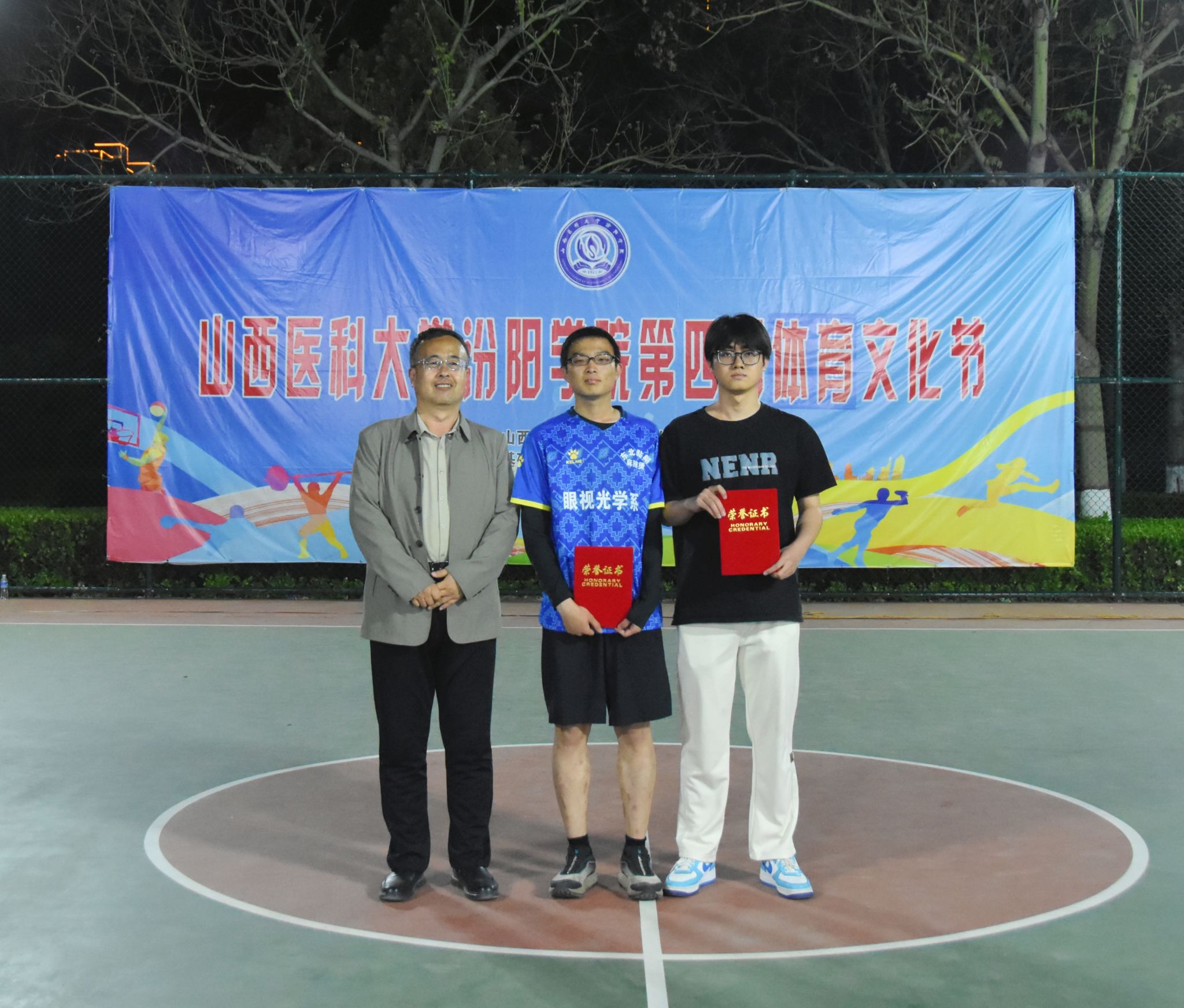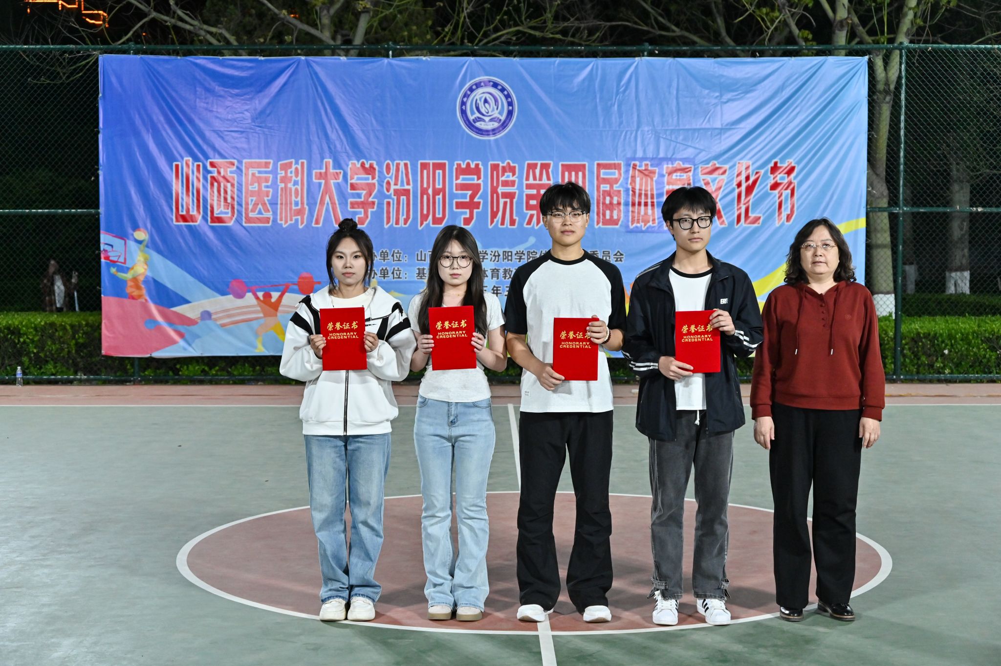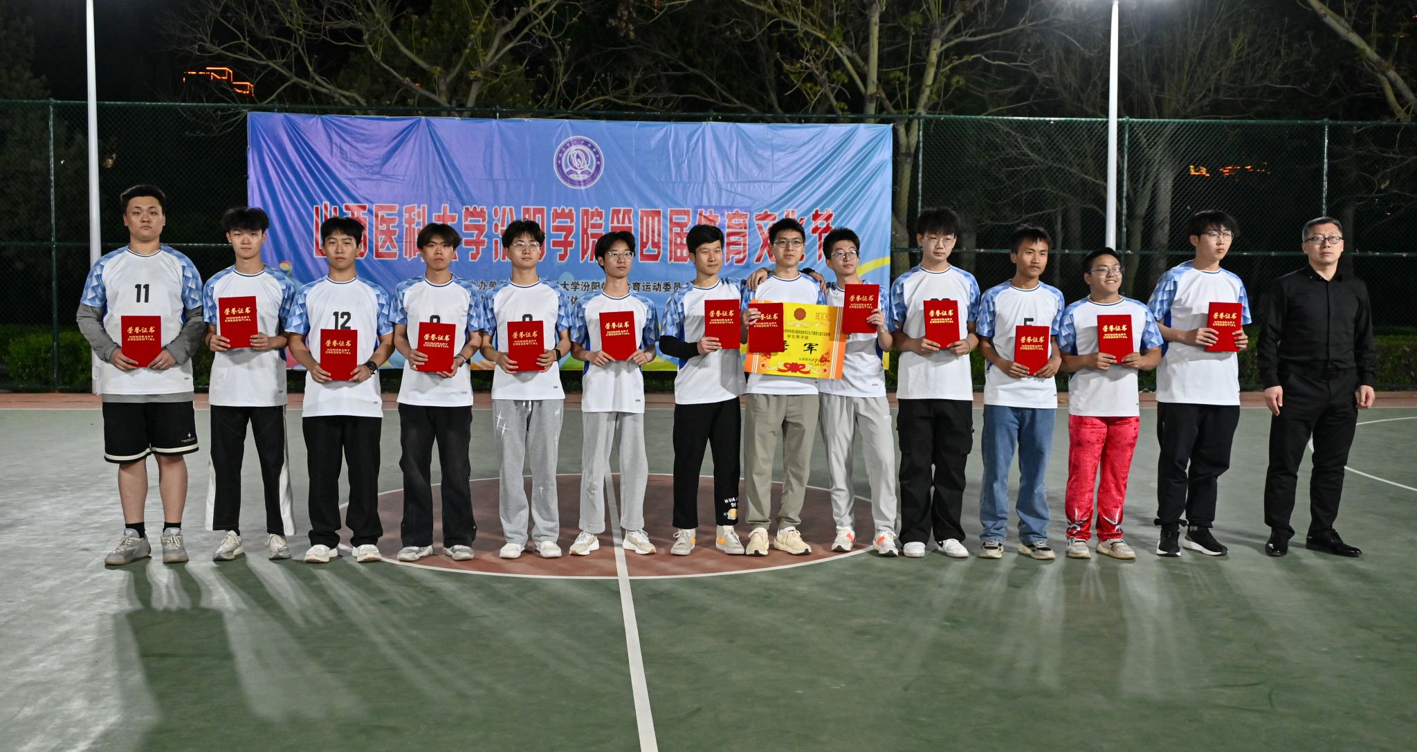 在校体育运动委员会的统筹指导和各系部、相关职能部门的积极配合、全校师生的热情参与和共同努力下,基础医学部体育教研室精心组织的beat365第四届校园体育文化节顺利完成各项赛事,圆满落下帷幕。4月23日晚,闭幕式在篮球场隆重举行。校党委委员、副院长、体育运动委员会主任陈振文,体育运动委员会副主任、基础医学部主任乔海兵,各系部党总支书记、副书记,保卫处、学生工作部、团委等相关部门负责同志出席了闭幕式。