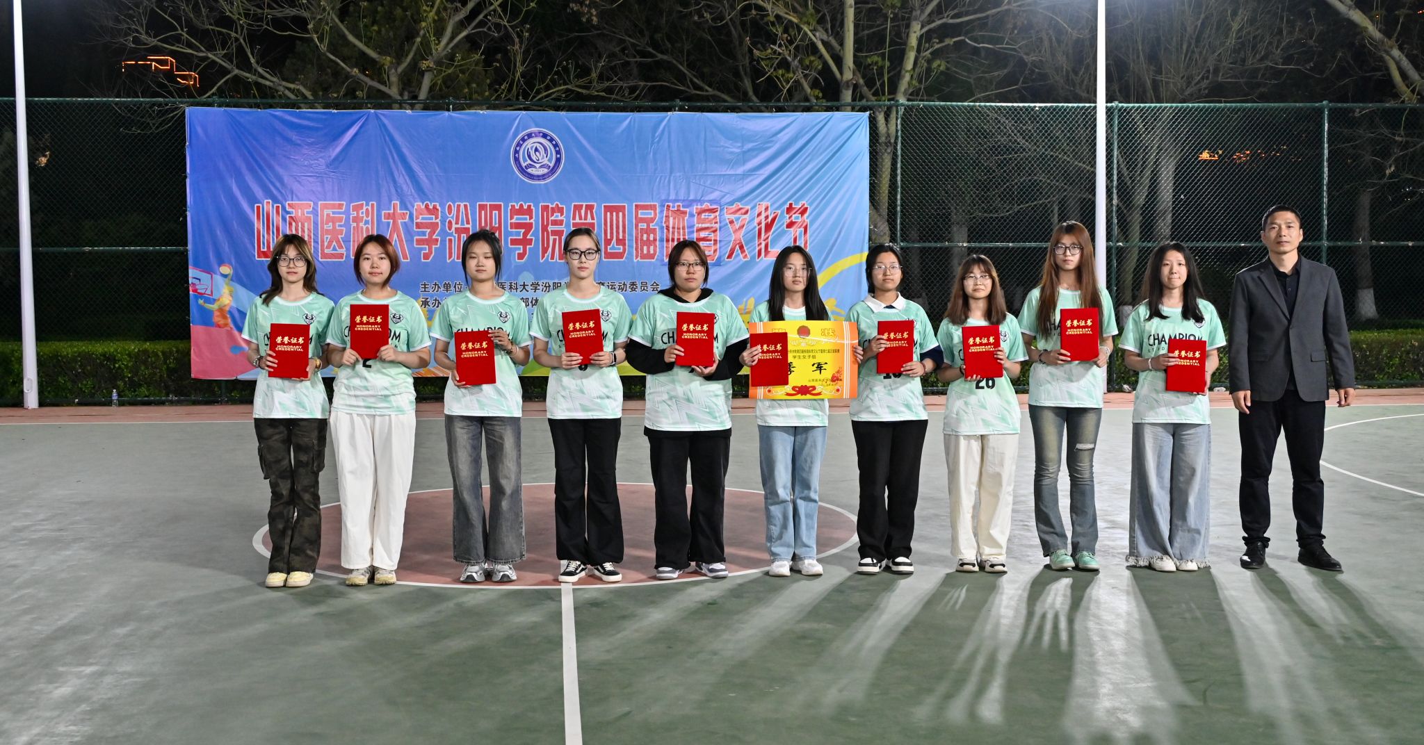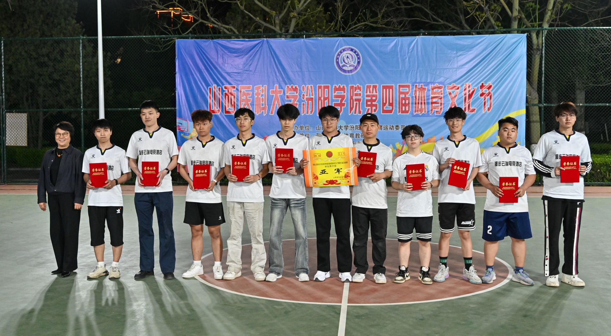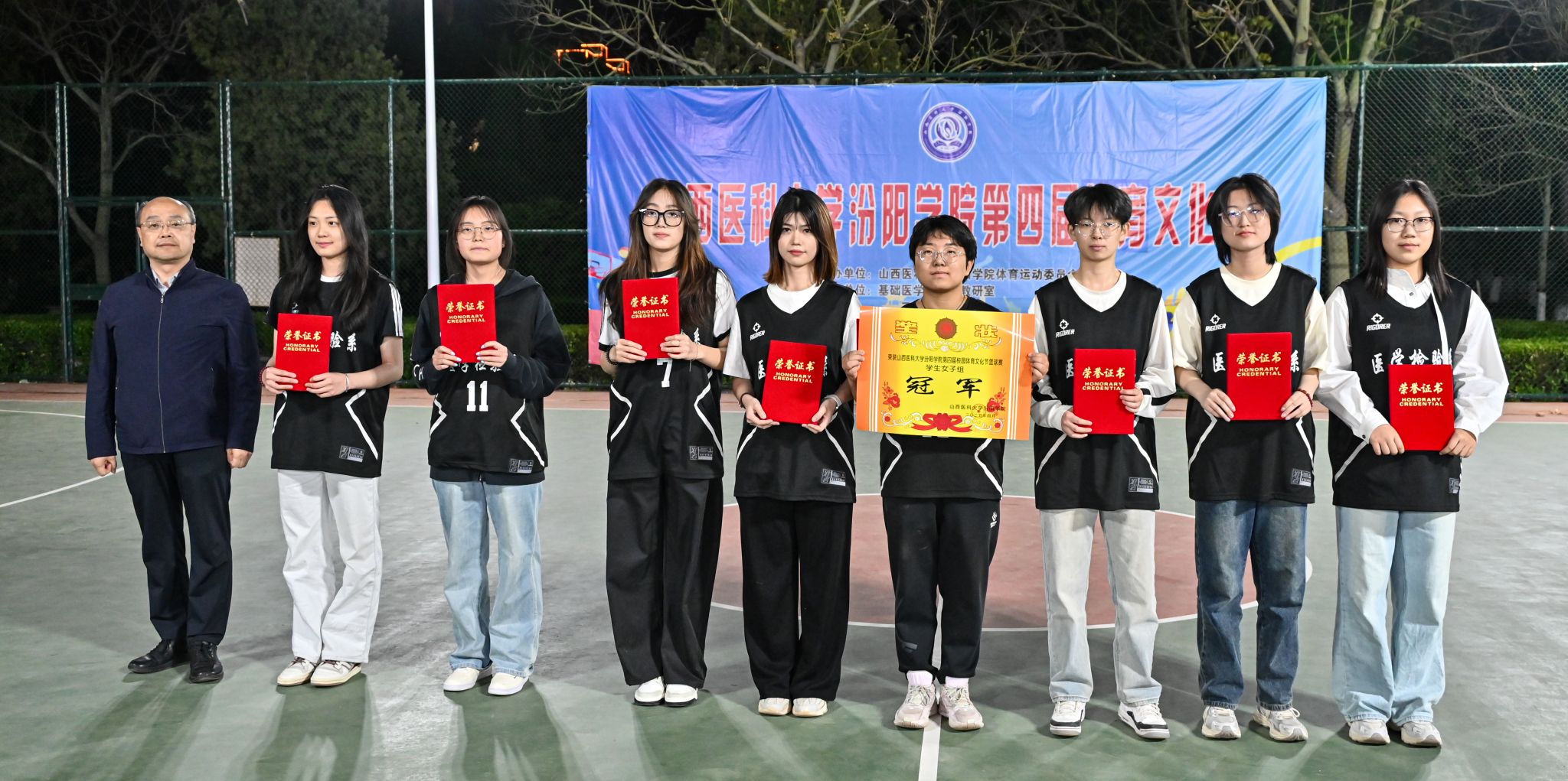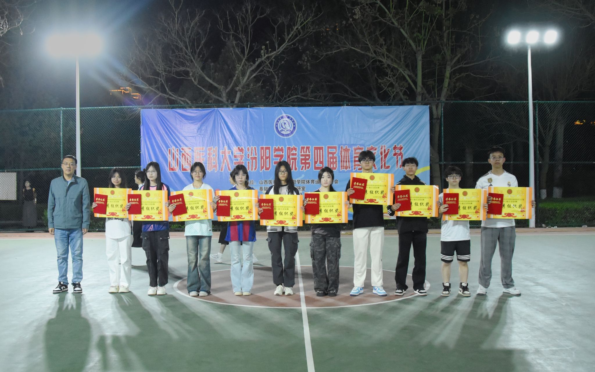 在校体育运动委员会的统筹指导和各系部、相关职能部门的积极配合、全校师生的热情参与和共同努力下,基础医学部体育教研室精心组织的beat365第四届校园体育文化节顺利完成各项赛事,圆满落下帷幕。4月23日晚,闭幕式在篮球场隆重举行。校党委委员、副院长、体育运动委员会主任陈振文,体育运动委员会副主任、基础医学部主任乔海兵,各系部党总支书记、副书记,保卫处、学生工作部、团委等相关部门负责同志出席了闭幕式。