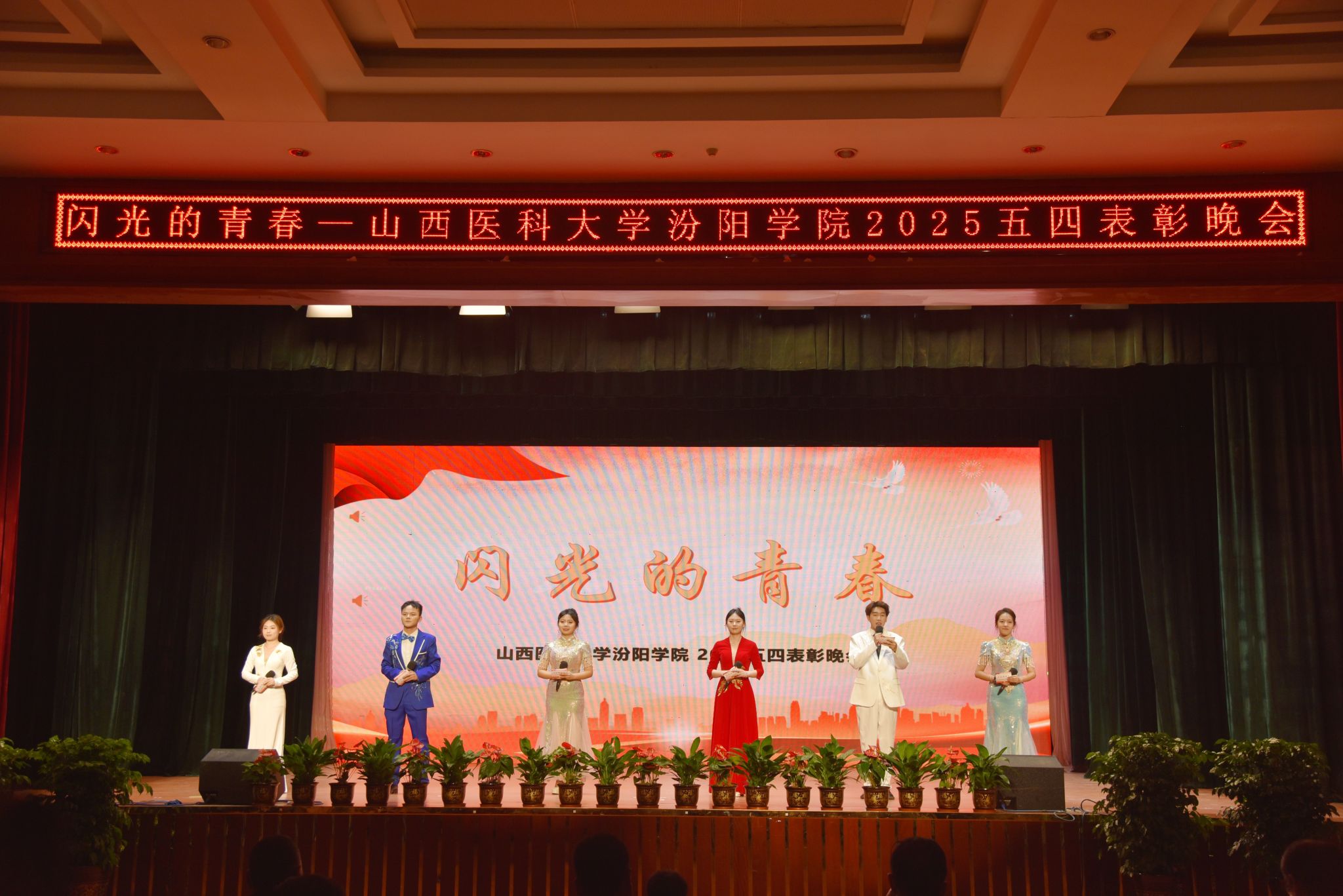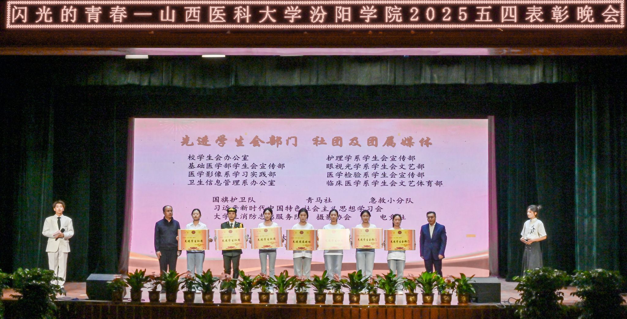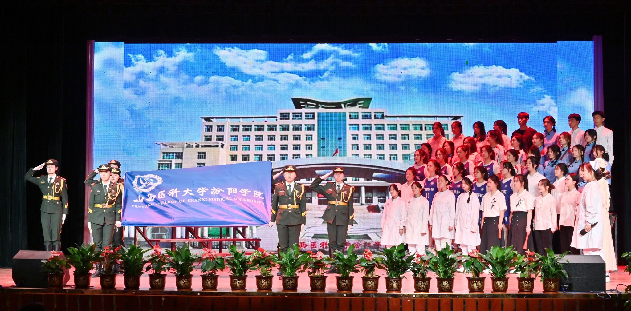 表彰晚会表演了丰富多彩、青春洋溢的文艺节目。民乐合奏和民族舞《清庭云月》等尽显文化自信的底气,现代舞《炽焰舞潮》《等你的回答》跳出了汾院青年的蓬勃朝气,合唱《星辰大海》唱出了汾院青年“披荆斩棘、向前奔赴”的勇气,朗诵《那一年,中国青年正十八》翻开历史画卷,展现了不同年代青年的人生追求,枪操、舞蹈《国旗下的橄榄绿》表现了beat365国旗护卫队、退役大学生士兵卫国卫家的热血豪情,情景剧《汾院楼影》讲述了一代代汾院人心系家国、守护健康的医者仁心,合唱《有我》喊出了“请党放心,强国有我”的青春诺言。