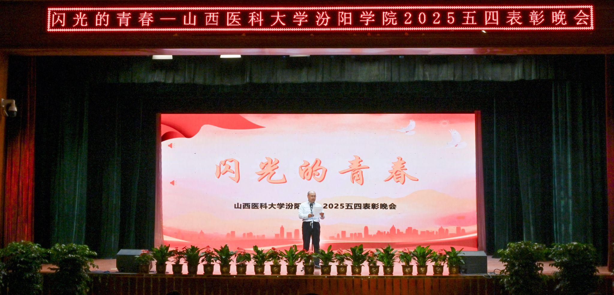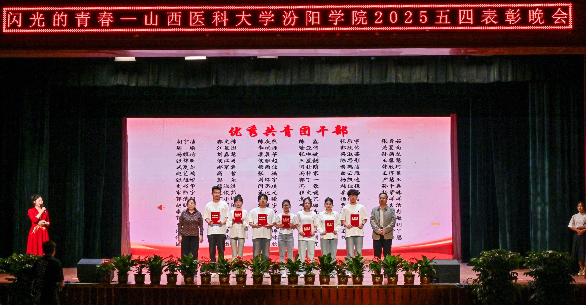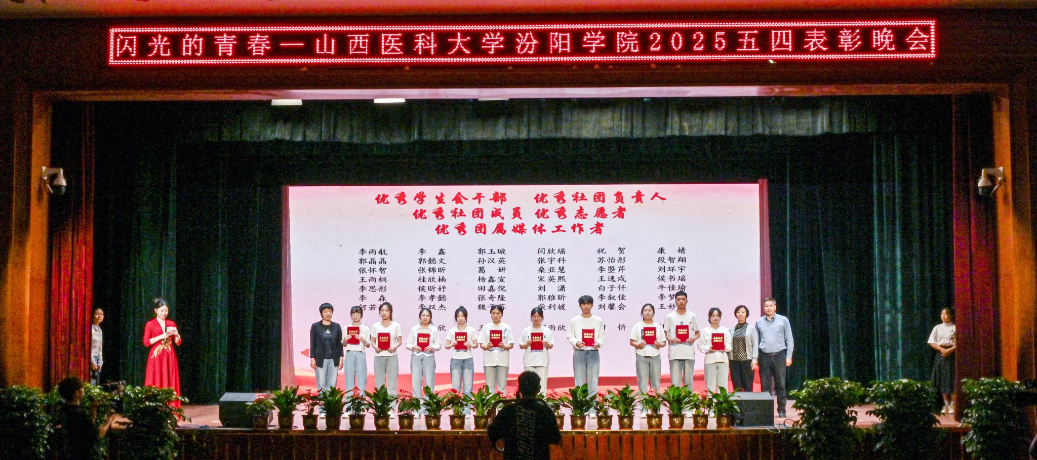 表彰晚会表演了丰富多彩、青春洋溢的文艺节目。民乐合奏和民族舞《清庭云月》等尽显文化自信的底气,现代舞《炽焰舞潮》《等你的回答》跳出了汾院青年的蓬勃朝气,合唱《星辰大海》唱出了汾院青年“披荆斩棘、向前奔赴”的勇气,朗诵《那一年,中国青年正十八》翻开历史画卷,展现了不同年代青年的人生追求,枪操、舞蹈《国旗下的橄榄绿》表现了beat365国旗护卫队、退役大学生士兵卫国卫家的热血豪情,情景剧《汾院楼影》讲述了一代代汾院人心系家国、守护健康的医者仁心,合唱《有我》喊出了“请党放心,强国有我”的青春诺言。
