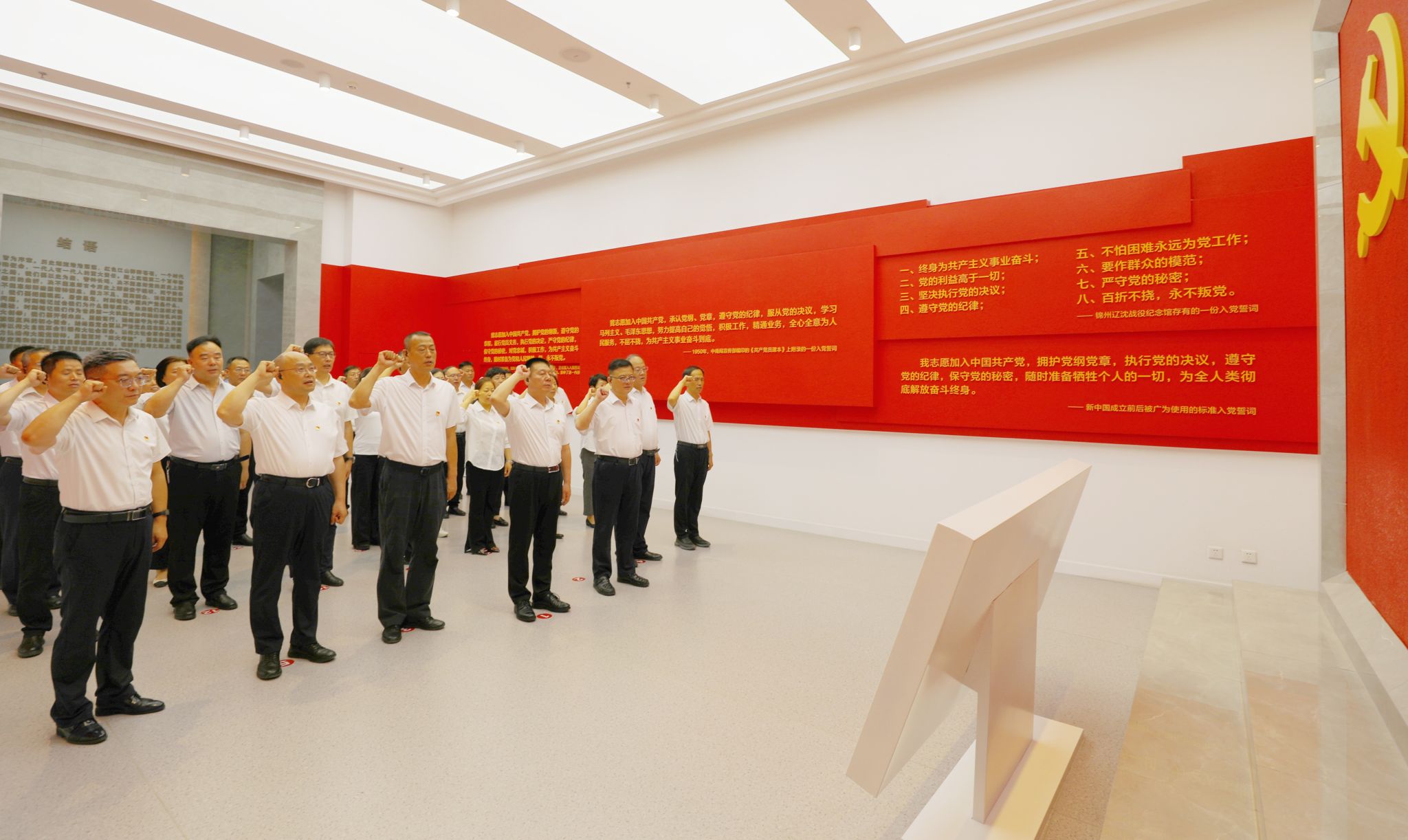 在讲解员的引导下,同志们依次参观了“铁规矩 金名片”“纠四风 治顽疾”“好作风 新征程”三大主题展区,通过详实的图文资料、鲜活的案例视频,重温了习近平总书记关于全面从严治党的重要论述,深刻感受到了党的十八大以来省纪委监委在山西省委的坚强领导下,持续加固中央八项规定堤坝,与时俱进纠“四风”树新风,深入推进全面从严治党的决心和成效。参观结束后,全体同志重温了入党誓词。