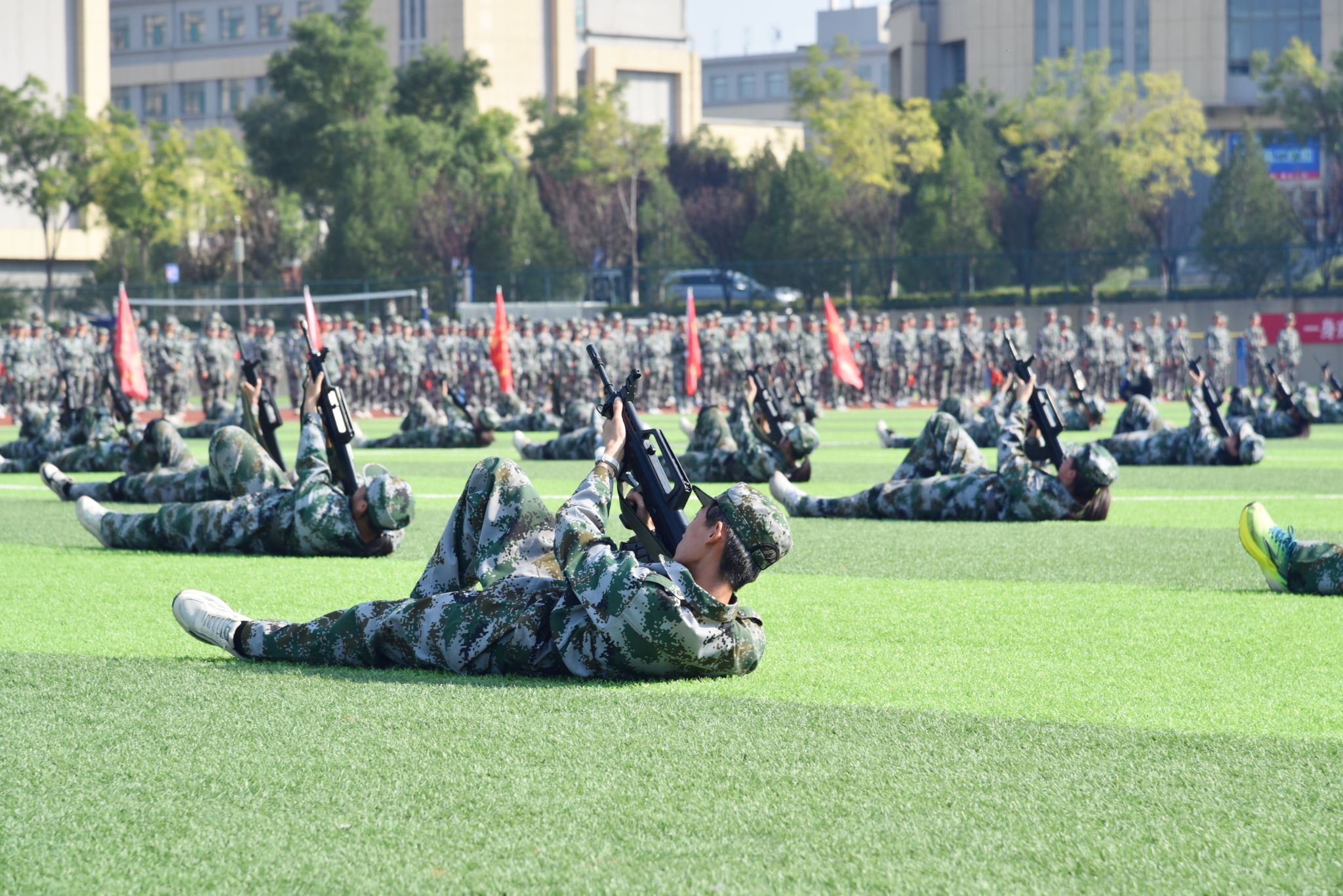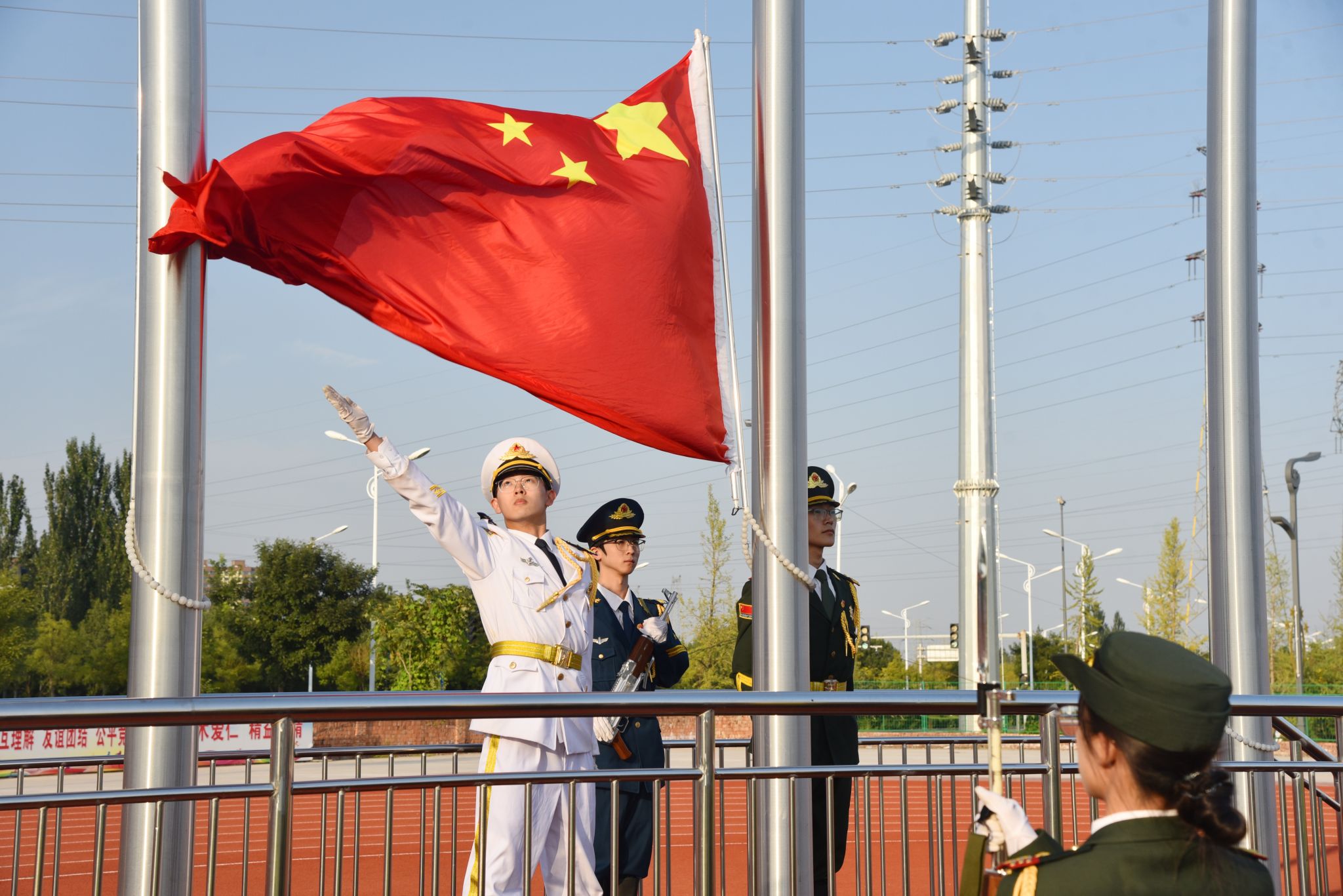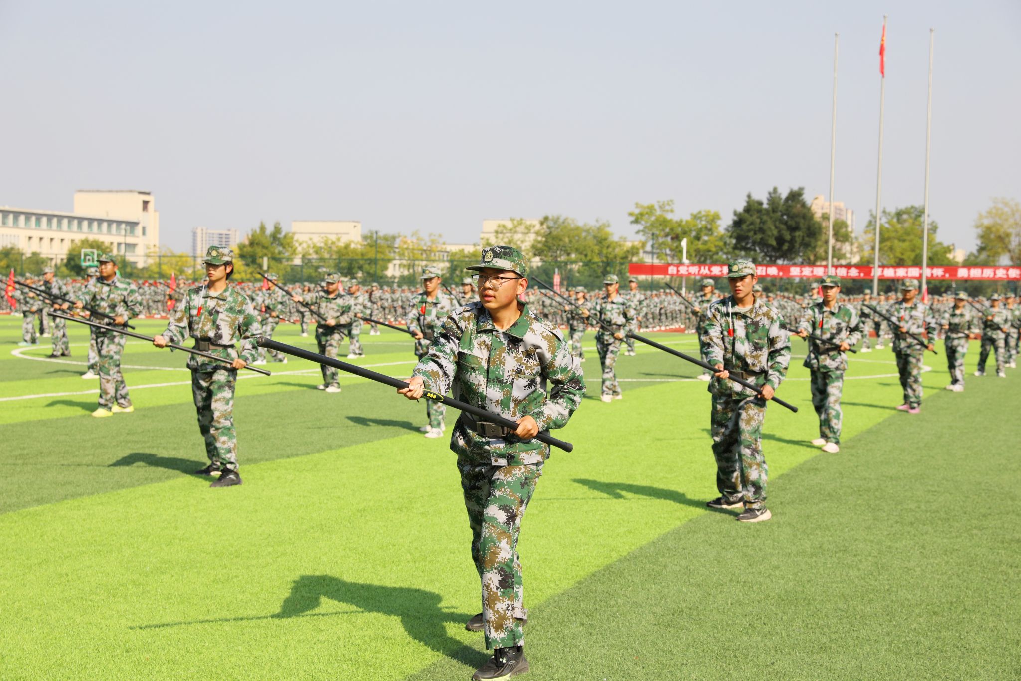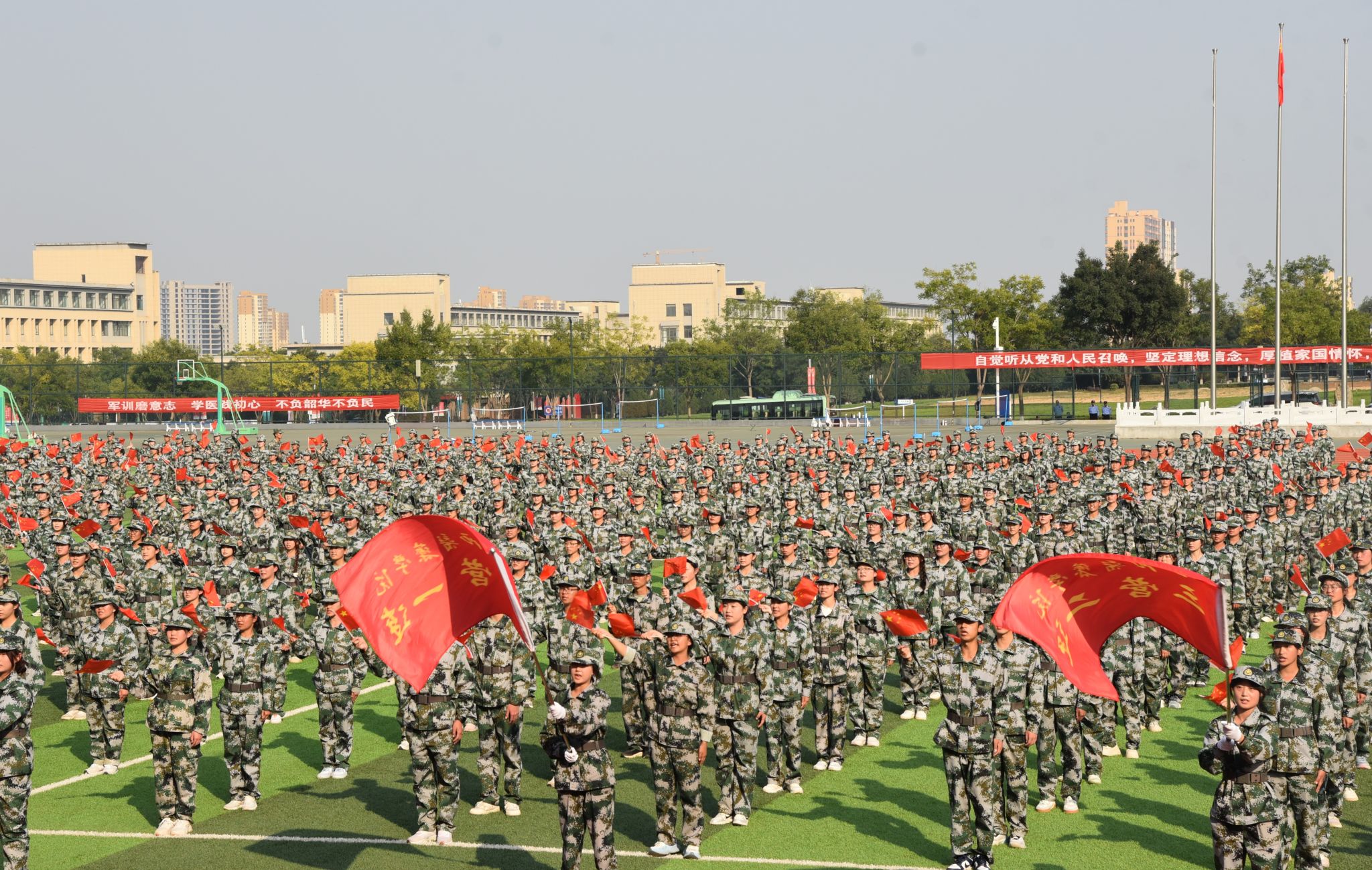 伴随着雄壮的国歌声,鲜艳的五星红旗冉冉升起,全体师生面向国旗,肃穆而立,行注目礼,2025级新生开学典礼暨军训会操拉开帷幕。