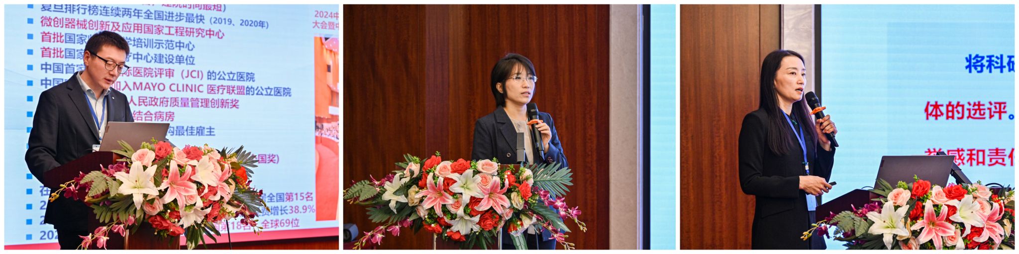 会上,浙大邵逸夫医院徐俊杰研究员、中国医学科学院血液病医院科技管理处处长祁健伟、中南大学湘雅医院科研部主任郭华、复旦大学附属中山医院科研处副处长李卡、南京医科大学第一临床医学院副院长张雪静、苏州大学附属儿童医院科研处处长丁胜以及南方医科大学深圳医院科技创新部负责人艾莉莎围绕医院高质量发展、科技成果转化、科研平台建设、国家级科研项目申报等作了精彩报告。