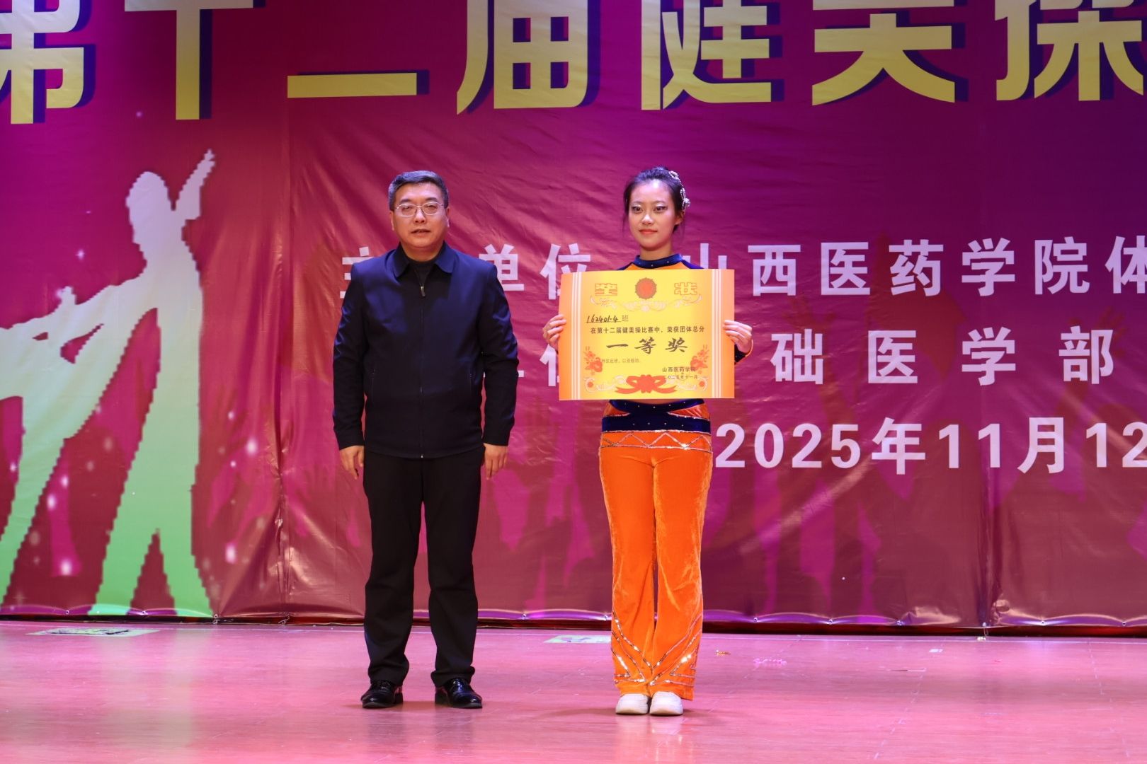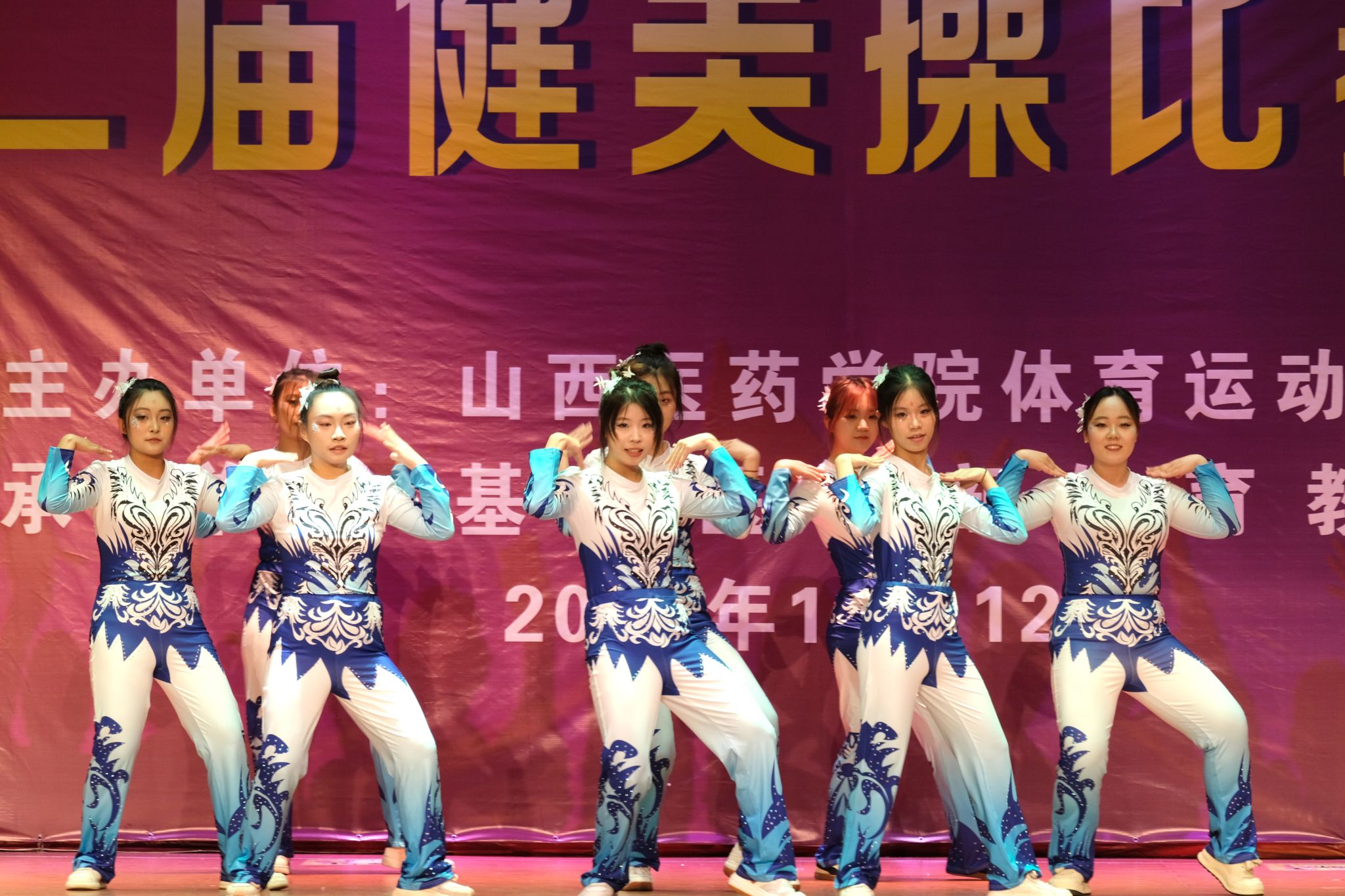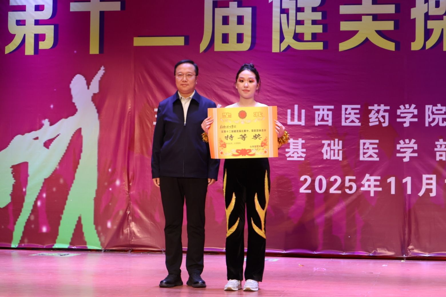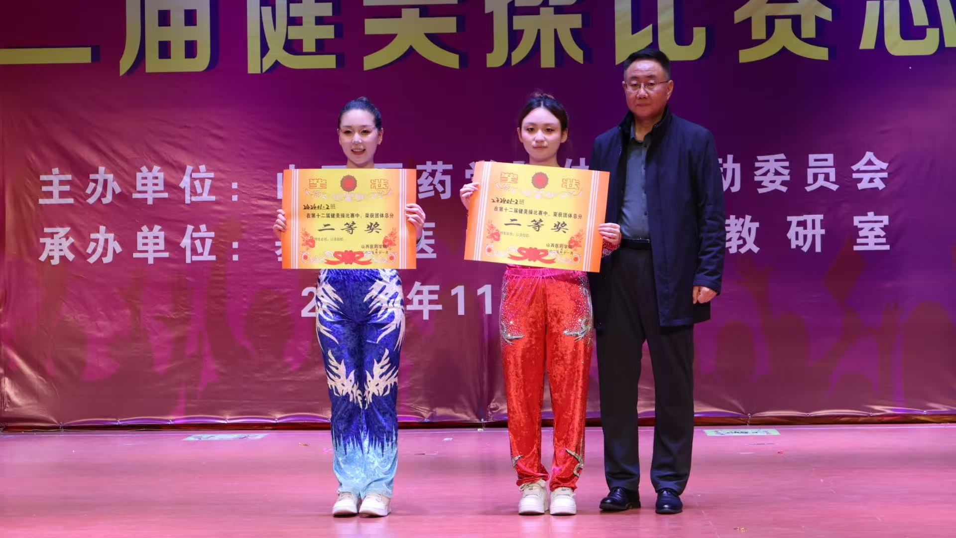 舞动青春,绽放活力。为认真贯彻落实习近平总书记关于加快建设体育强国的重要论述,丰富校园文化生活,展现山医药学子的青春风采与团队协作精神,11月12日,由校体育运动委员会主办、基础医学部体育教研室承办的beat365第十二届健美操比赛总决赛在文体活动中心举行。党委副书记王伟,党委委员、副院长杨利军,相关职能部门负责同志及各系部党总支书记、副书记出席决赛,学生处、团委及体育教研室的7位老师共同担任裁判员,参赛班级辅导员、啦啦队为参赛队伍现场助威。