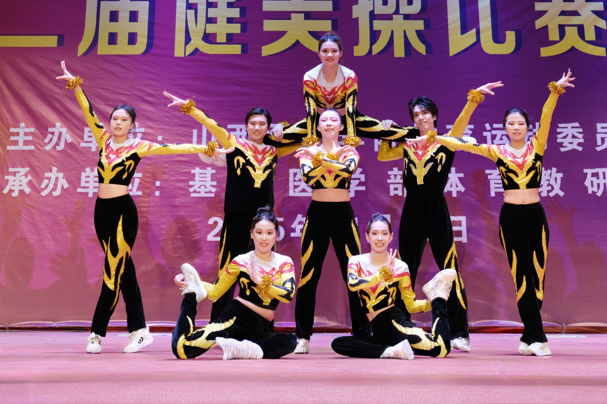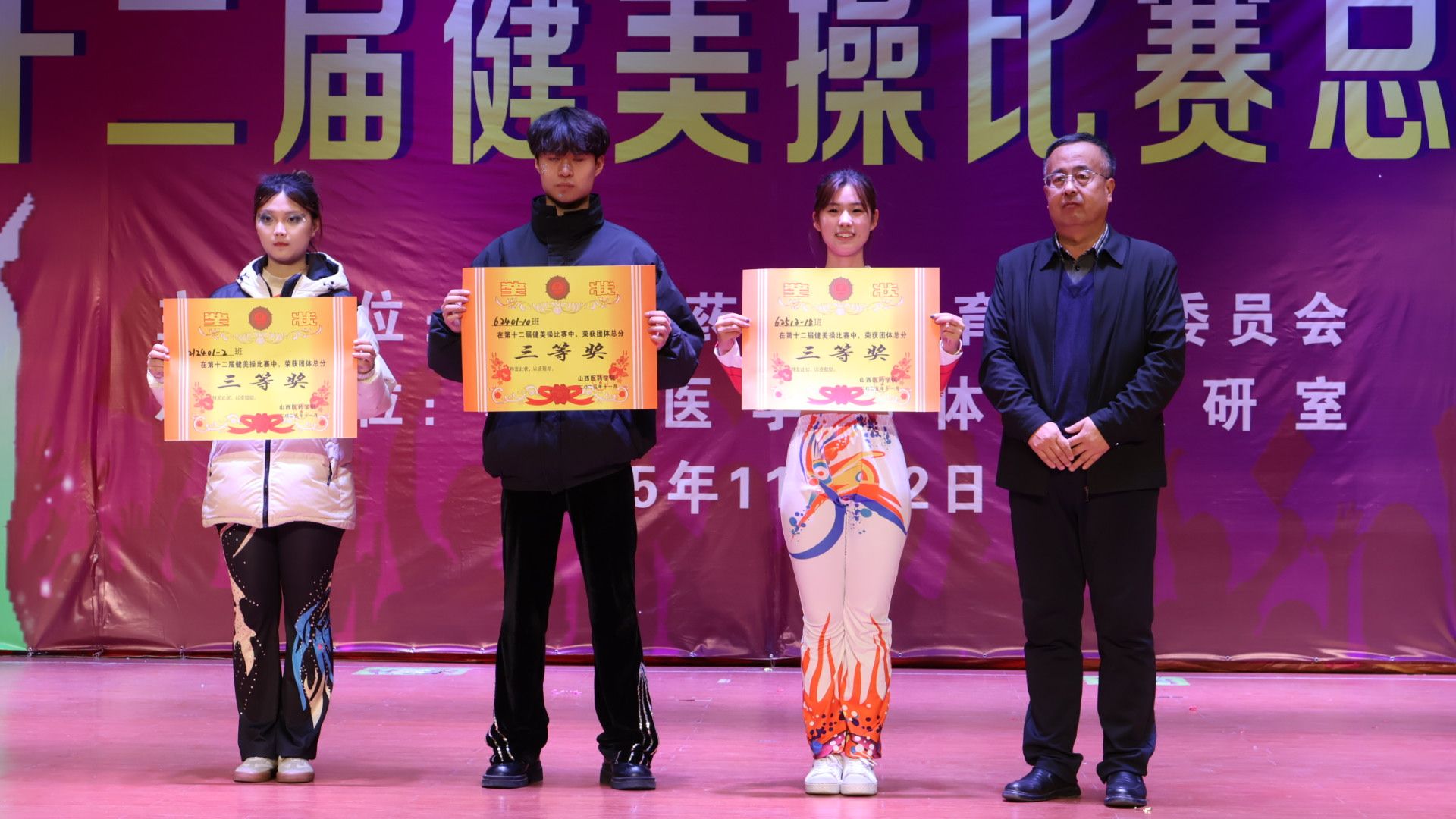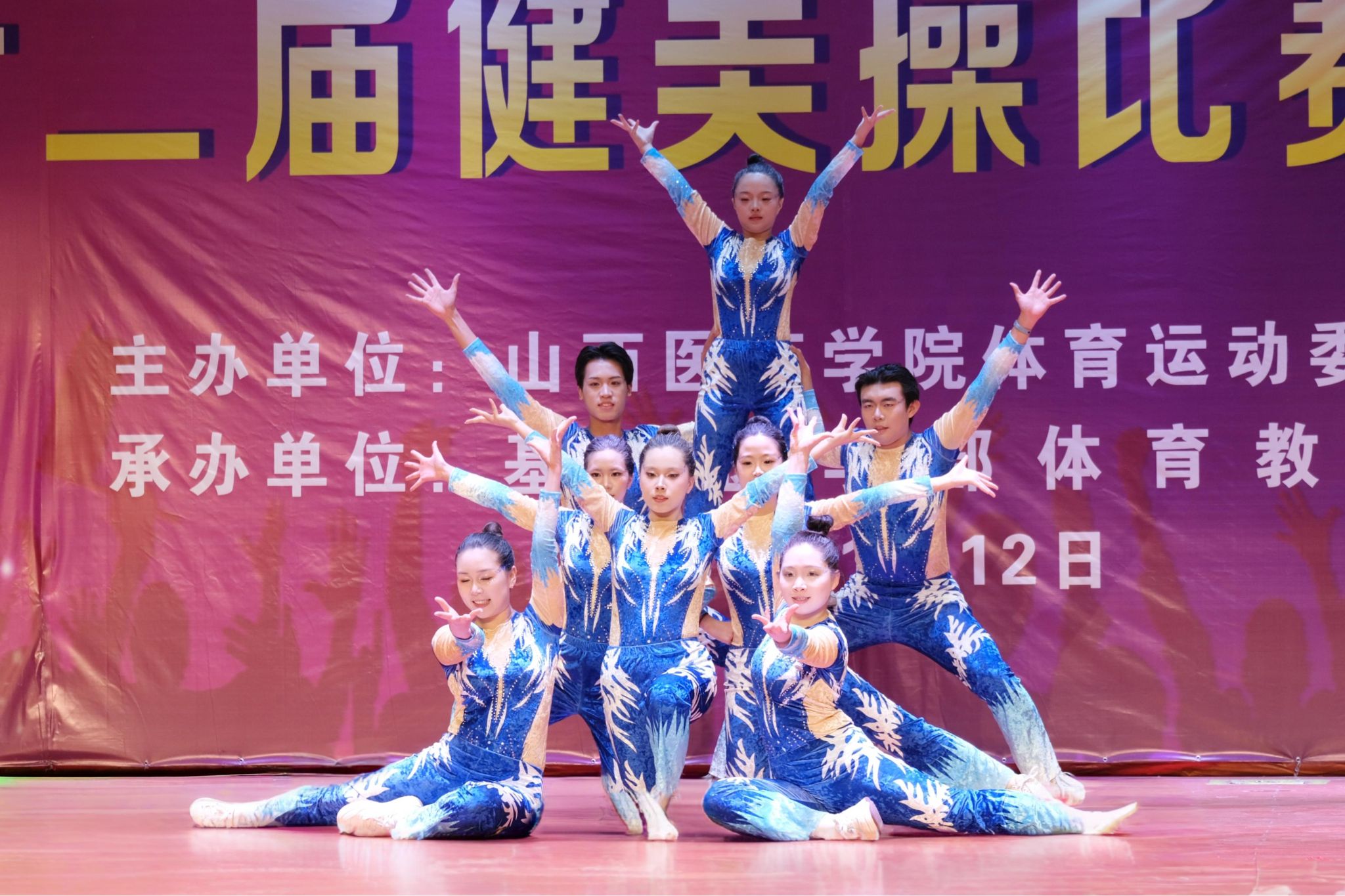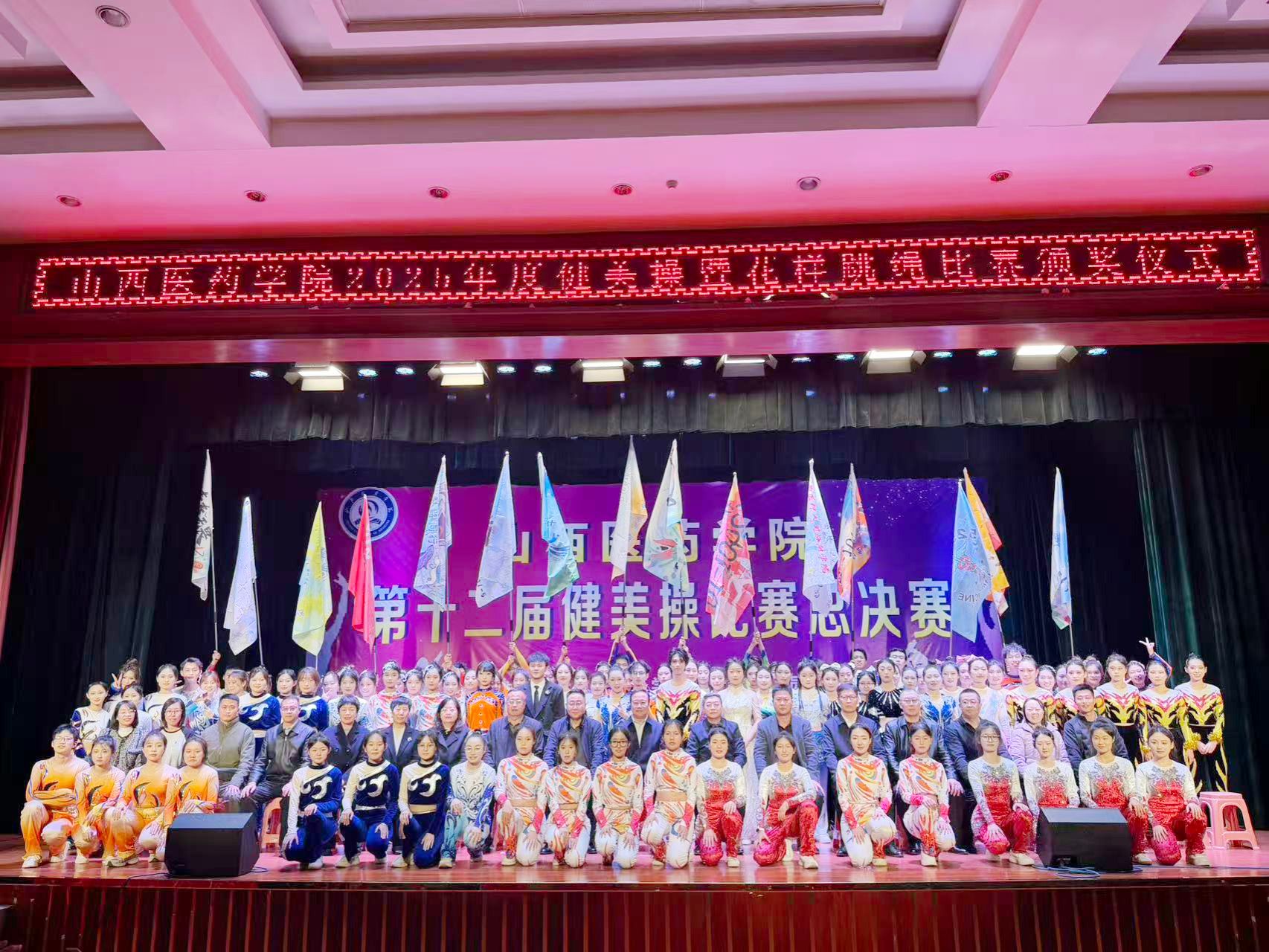 舞动青春,绽放活力。为认真贯彻落实习近平总书记关于加快建设体育强国的重要论述,丰富校园文化生活,展现山医药学子的青春风采与团队协作精神,11月12日,由校体育运动委员会主办、基础医学部体育教研室承办的beat365第十二届健美操比赛总决赛在文体活动中心举行。党委副书记王伟,党委委员、副院长杨利军,相关职能部门负责同志及各系部党总支书记、副书记出席决赛,学生处、团委及体育教研室的7位老师共同担任裁判员,参赛班级辅导员、啦啦队为参赛队伍现场助威。
