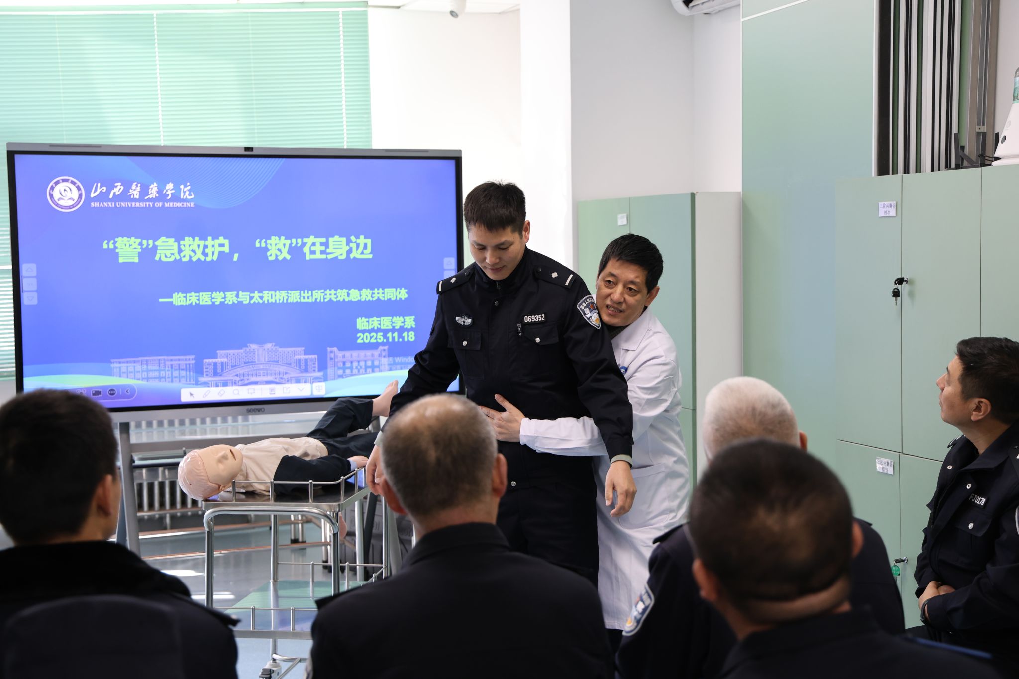 为持续推动“我为群众办实事”走深走实,进一步增强基层一线工作人员的应急救护能力,11月18日至19日,临床医学系在保卫处的协调支持下,在我校OSCE中心为汾阳市太和桥派出所全体干警、义警开展急救技能专题培训。太和桥派出所所长郑俊杰、指导员杨剑峰,临床医学系党总支书记贾爱萍、系主任韩文萍,保卫处处长梁勇刚,临床医学系党总支副书记郭晋,保卫处治安科负责人韩志远等出席活动。