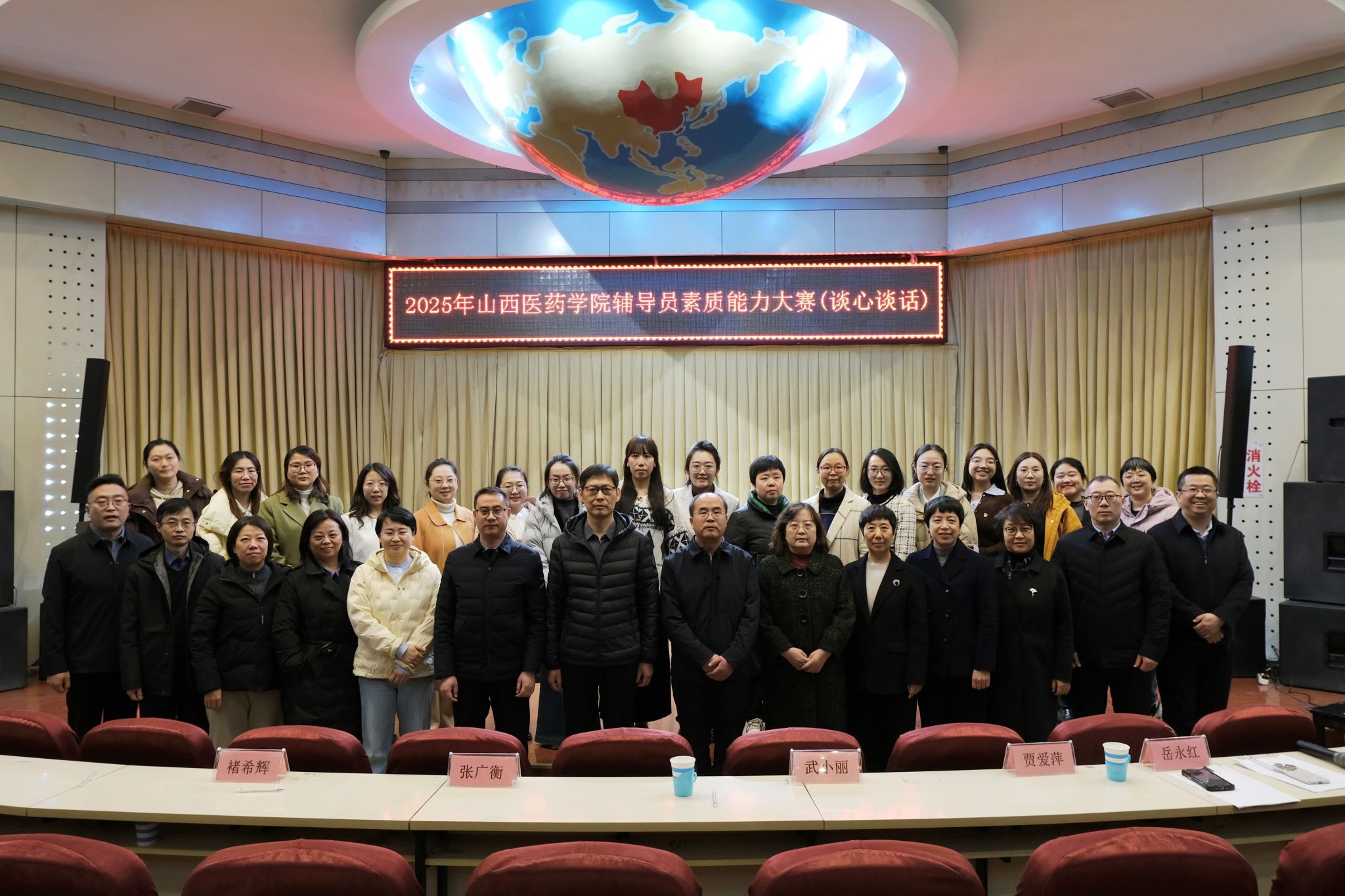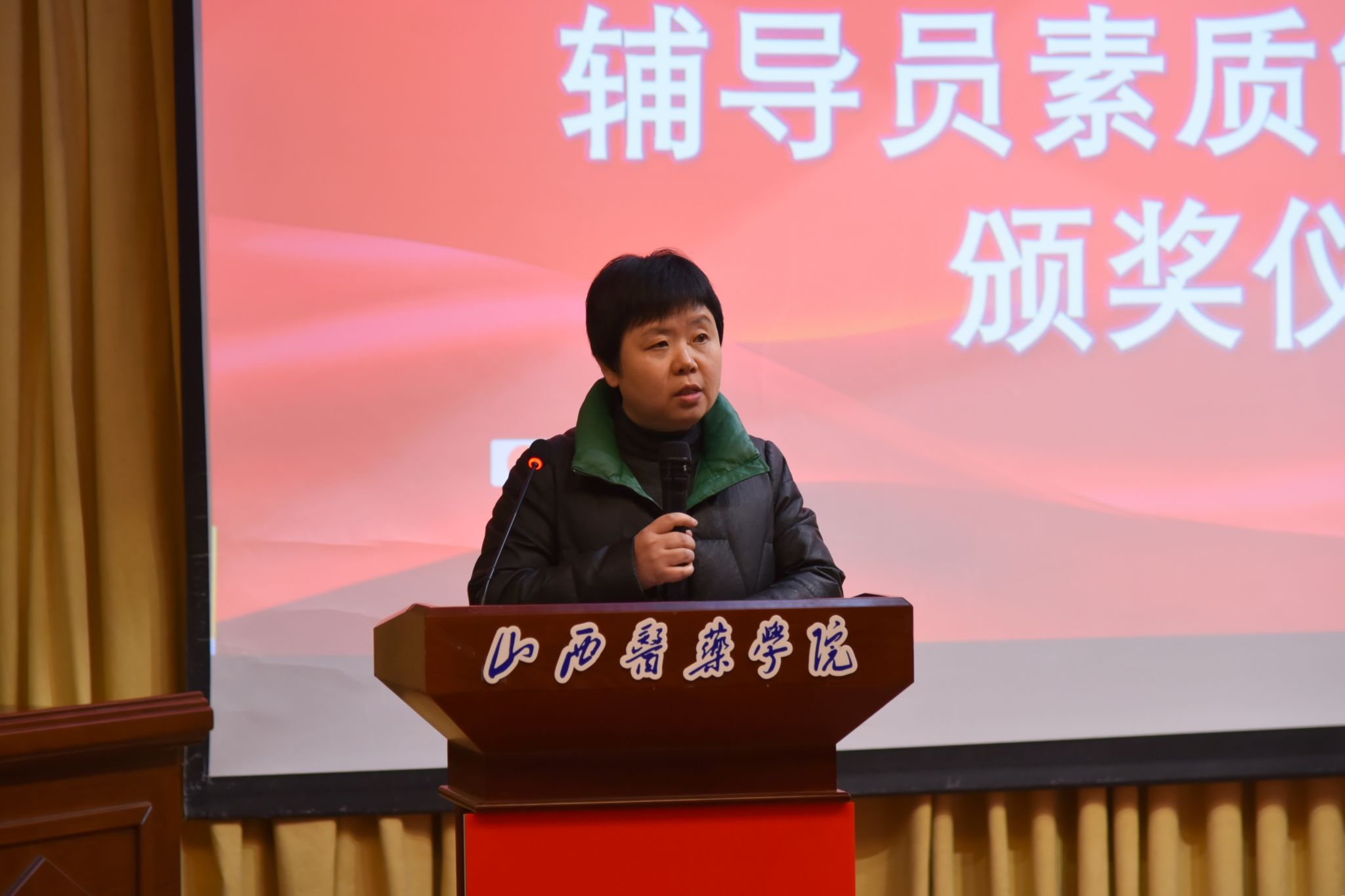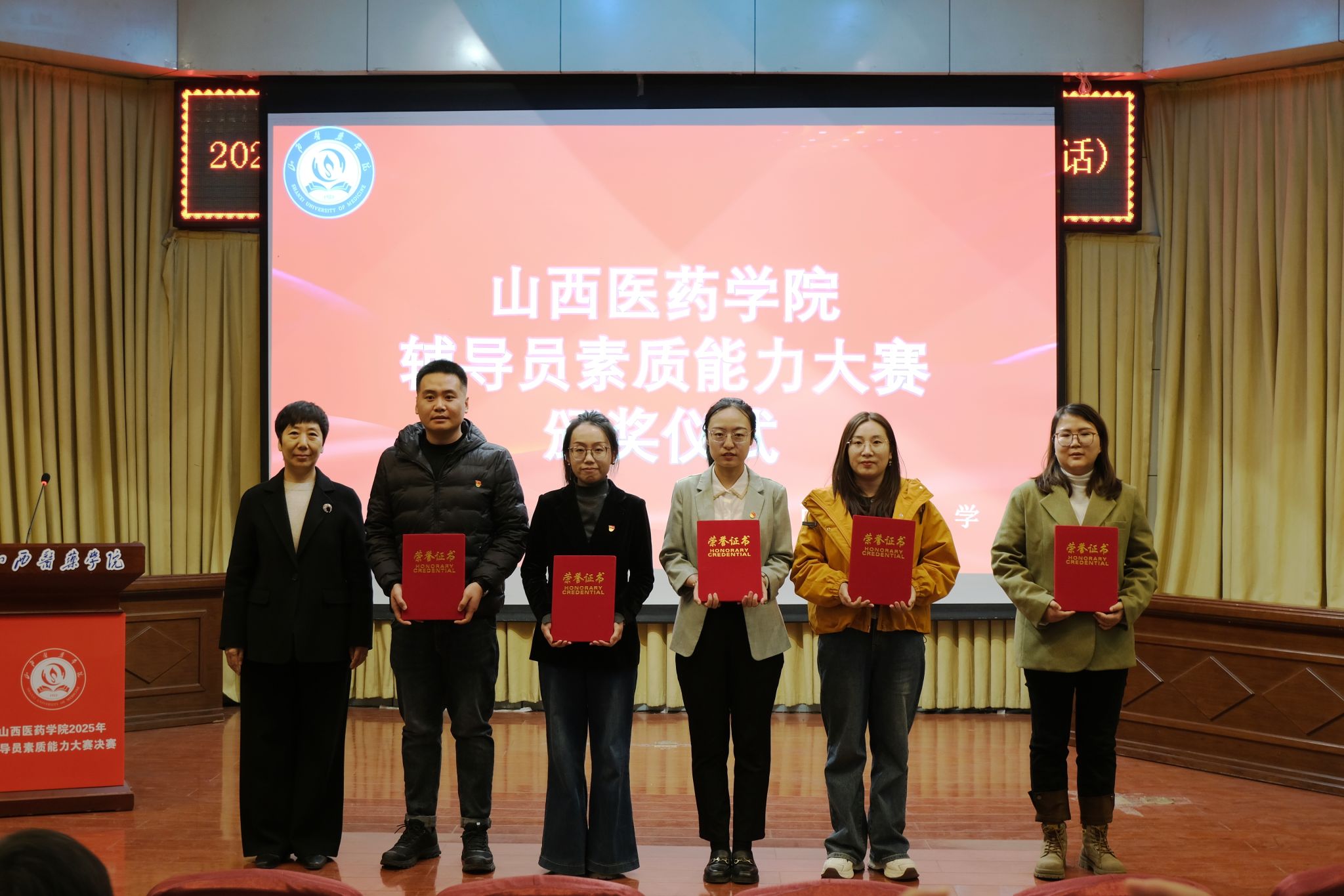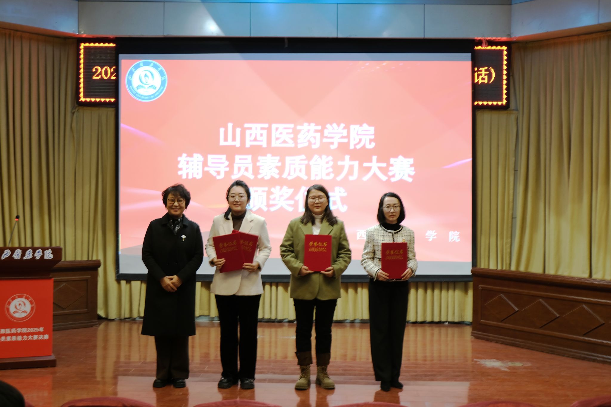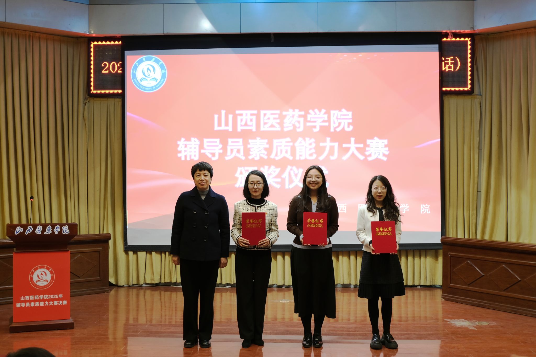 经过激烈角逐,李晨获大赛一等奖;陈美妍、郭嘉怡、权迪获二等奖;武明丹、沙云玉、李小龙、赵玮、赵艳获三等奖;杨谷文、许亚平、张冠蓉、王鑫、王静、武帅瑾、李洁雨获优秀奖。陈美妍、武明丹、李晨分别获基础知识测试、学情分析、案例研讨、谈心谈话环节单项奖。与会领导为获奖者颁奖。